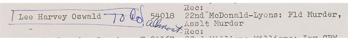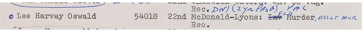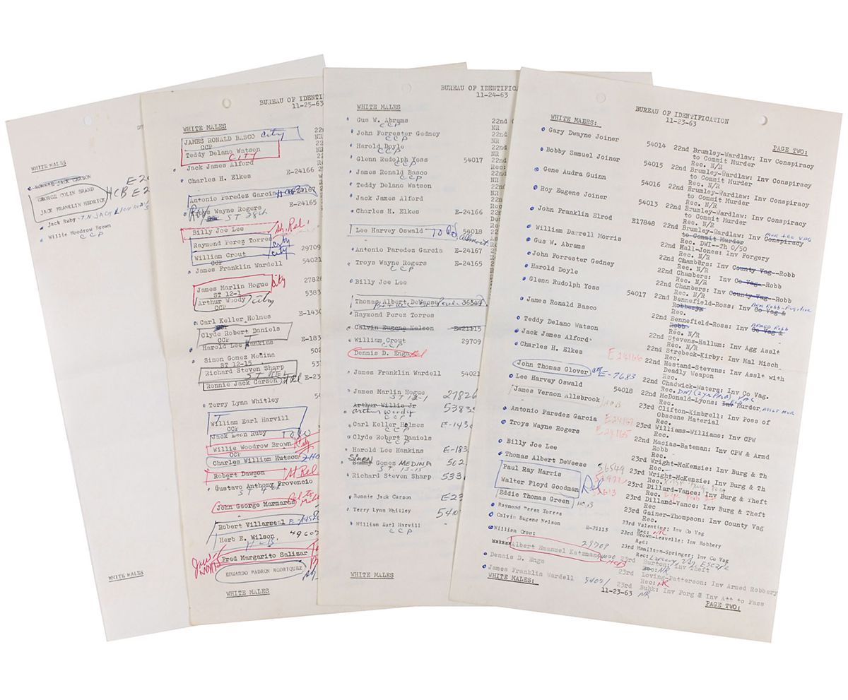 Original Dallas City Jail prisoner lists from November 23 to November 25, 1963, four pages, 8.5 x 14, featuring the names of both Lee Harvey Oswald and Jack Ruby. On the earliest page, November 23, lists “Lee Harvey Oswald” as a white male, identifying his arresting officers and charges, “McDonald-Lyons: Fld. Murder, Asslt. Mur.” The list from November 24 contains the same information, but with a square drawn around his name and the notation, “To Co,” indicating that he was being transferred from the city jail to the county jail. Beside this notation, a clerk with an irreverent sense of humor wrote, “allmost [sic],” as Oswald was shot in the city jail’s basement. The list from the following day includes the shooter, “Jack Leon Ruby,” charged with “Fld. Murder.” In overall fine condition. Accompanied by a letter of provenance from Henry Ellison, who was an assistant jailer at the time. This set of documents is a one-of-a-kind chronicle of the events that followed JFK’s assassination, from Oswald’s apprehension through his death.