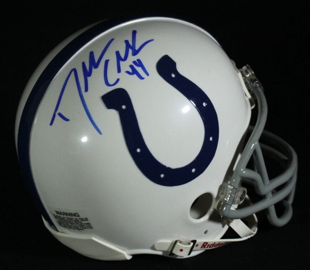 Riddell Colts mini-helmet hand-signed in blue felt tip pen. The autograph has been reviewed and authenticated by Global Authentics (GA) and includes their official serially numbered hologram and matching COA.