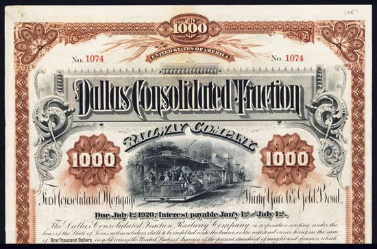 Texas, 1890, $1000, 6% Thirty Year 1st Consolidated Mortgage Gold Bond, Issued and Uncancelled Bond, #1074, Black on brown border and underprint, Electric trolley moving down city road top center with horse and buggy on right, VF-XF condition, ABNC.
