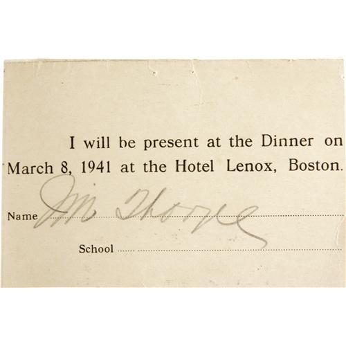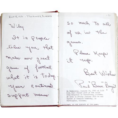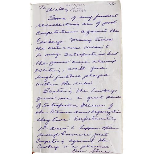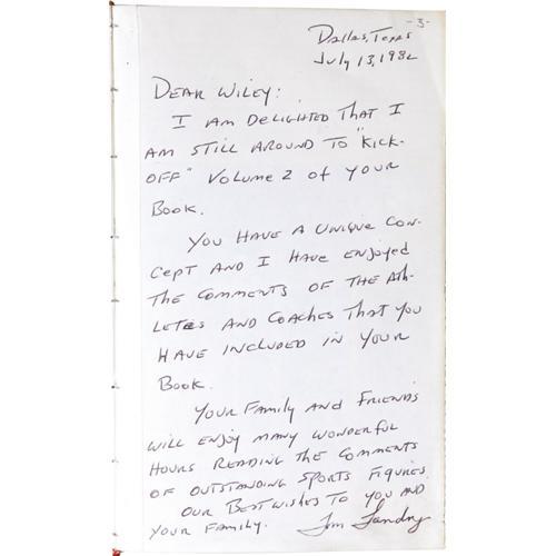 <B>"Everything I Know about the Dallas Cowboys," Volume Two.</B></I> Tom Landry again kicks off volume two writing how much he enjoyed viewing volume one and looks forward to reading the next group of responses about the Cowboys. Paul Bear Bryant is the next entry followed by a Jim Thorpe signed invitation from 1941, Jess Neely, Don Shula (who talks about his game battles with the Cowboys), Don Hutson, Bob Devaney, Jim Hanifan, Billy Sullivan, Walt Michaels, Joe Gibbs , Lamar Hunt, Don Perkins, Charles McClendon, Cho Cho Justice, Johnny Majors, Paul Dietzel, Don James, Bob Mathias, Paul Wiggin, LaVell Edwards, Bill Dudley, Bart Starr, Adam Walsh (Notre Dame 1922-24), Chuck Knox, Danny White, Leon Hart, Gen Bill Carpenter, Billy Cannon , Pat O'Brien (who also signed his letter "Rock" since he played Coach Knute Rockne in the Gipp movie with Reagan), Terry Donahue, John David Crow, Keith Jackson, Bobby Dodd, Frank Sinkwich, Jack Kemp, Calvin Hill, John Cappelletti, Kyle Rote, Tom Harmon, Pete Rozelle (two pages great content about continued success of the Cowboys and his 24 year relationship with Landry and Schram), Marion Motley, Larry Kelly , Bill Bates LeRoy Jordan, Bronko Nagurski, Lee Iacocca, Woody Hayes and many others. <BR><BR><BR> Wiley Grinnell was, like most Texans, a football fan. He had played and coached the game for many years. He also was a Dallas Cowboys fan and was kidded constantly about how much he knew about the Cowboys. So for a birthday gift his wife and son gave him a large hardback book entitled "Everything I Know About the Dallas Cowboys. by Wiley Grinnell." The book was several hundred pages. The joke was that each page was blank. Grinnell decided over the next several years that he would get Cowboy players, coaches, opponents and other coaches and famous people to give their opinions on the Cowboys.<BR><BR> He would either visit or send the actual book to the person, who would usually respond by writing a letter about the Cowboys and sending it back him. Most of the responses are actually written directly in the book. If someone would send back a separate letter, he would paste it into the book. His responses were outstanding from Presidents of the United States to coach Tom Landry. Even opposing coaches such as Don Shula and George Allen chipped in about their opinions about the Cowboys. Many of the letters offer outstanding unique content never seen before. Some of the letters are worth hundreds of dollars each. However, to preserve history, we are offering each volume intact, each with a treasure trove of Cowboys lore. There are pictures and information about each respondent in this homemade book throughout to support the autographed letters and signatures.