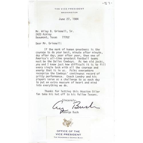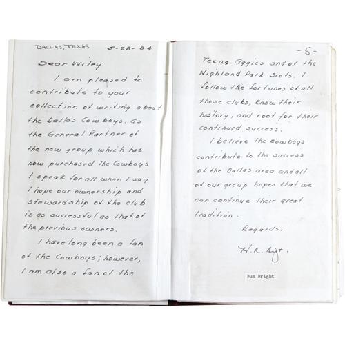 <B>"Everything I Know about the Dallas Cowboys," Volume Three.</B></I> This volume includes George Allen, Donny Anderson, Bob Breunig, Bum Bright, George H. Bush as Vice President (autopen), Dave Wannstedt, Bud Adams, George Connor, Gerry Faust, Bob Griese, Bon Hope, Paul Hornung, Jimmy Johnson, Dante Lavelli, Max McGee, Jim Mora, Earl Morrall, Steve Pelluer, Mike Shula, Doak Walker, Ralph Wilson Jr and others. George Allen stated in his letter "The Dallas Cowboys were my #1 rival. If I had my way, I'd like to play Dallas in a 16 game schedule, plus six pre season games. They might win a few games at the start but in the end we would win 10 straight games (and I mean any team I coach against them!) The main reason is my teams would be tougher, more physical. And in better condition. We'd whip them in the 4th quarter. I respect the Dallas Cowboys. They are one of the finest organizations in football. Tex Schram, Tom Landry and Gil Brandt do a good job." <BR><BR><BR> Wiley Grinnell was, like most Texans, a football fan. He had played and coached the game for many years. He also was a Dallas Cowboys fan and was kidded constantly about how much he knew about the Cowboys. So for a birthday gift his wife and son gave him a large hardback book entitled "Everything I Know About the Dallas Cowboys. by Wiley Grinnell." The book was several hundred pages. The joke was that each page was blank. Grinnell decided over the next several years that he would get Cowboy players, coaches, opponents and other coaches and famous people to give their opinions on the Cowboys.<BR><BR> He would either visit or send the actual book to the person, who would usually respond by writing a letter about the Cowboys and sending it back him. Most of the responses are actually written directly in the book. If someone would send back a separate letter, he would paste it into the book. His responses were outstanding from Presidents of the United States to coach Tom Landry. Even opposing coaches such as Don Shula and George Allen chipped in about their opinions about the Cowboys. Many of the letters offer outstanding unique content never seen before. Some of the letters are worth hundreds of dollars each. However, to preserve history, we are offering each volume intact, each with a treasure trove of Cowboys lore. There are pictures and information about each respondent in this homemade book throughout to support the autographed letters and signatures.