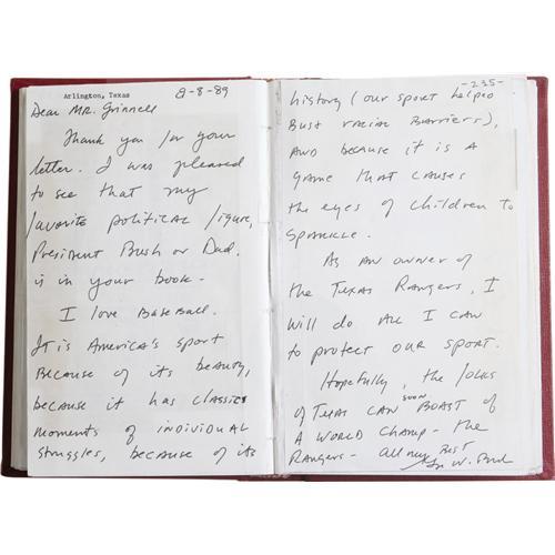 <B>"Everything I Know about the Dallas Cowboys," Volume Six.</B></I> Includes responses from Jay Berwanger, George W Bush (hand written letter while with Texas Rangers), Gary Beban, Joe Bugel, Doc Blanchard, Daryl Dickey, Art Donovan, Doug Enghish, Terry Hanratty, Jerry Jones, Tom Lasorda, Bill McCartney, Richard Nixon, Jerry Rhome, RC Slocum, Jeff van Note, John Wooden, Jerrel Wilson. <BR><BR><BR> Wiley Grinnell was, like most Texans, a football fan. He had played and coached the game for many years. He also was a Dallas Cowboys fan and was kidded constantly about how much he knew about the Cowboys. So for a birthday gift his wife and son gave him a large hardback book entitled "Everything I Know About the Dallas Cowboys. by Wiley Grinnell." The book was several hundred pages. The joke was that each page was blank. Grinnell decided over the next several years that he would get Cowboy players, coaches, opponents and other coaches and famous people to give their opinions on the Cowboys.<BR><BR> He would either visit or send the actual book to the person, who would usually respond by writing a letter about the Cowboys and sending it back him. Most of the responses are actually written directly in the book. If someone would send back a separate letter, he would paste it into the book. His responses were outstanding from Presidents of the United States to coach Tom Landry. Even opposing coaches such as Don Shula and George Allen chipped in about their opinions about the Cowboys. Many of the letters offer outstanding unique content never seen before. Some of the letters are worth hundreds of dollars each. However, to preserve history, we are offering each volume intact, each with a treasure trove of Cowboys lore. There are pictures and information about each respondent in this homemade book throughout to support the autographed letters and signatures.