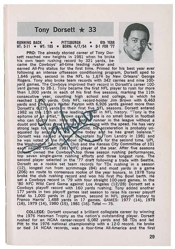 Dallas Cowboys media guide for the 1982 season, 5 x 7, 168 pages, signed inside by 58 members of the team. Signers include: Tony Dorsett, Drew Pearson, Randy White, Ed ‘Too Tall’ Jones, Danny White, Doug Cosbie, Billy Joe DuPree, Tony Hill, and Everson Walls. In fine condition, with scattered marks to the cover.