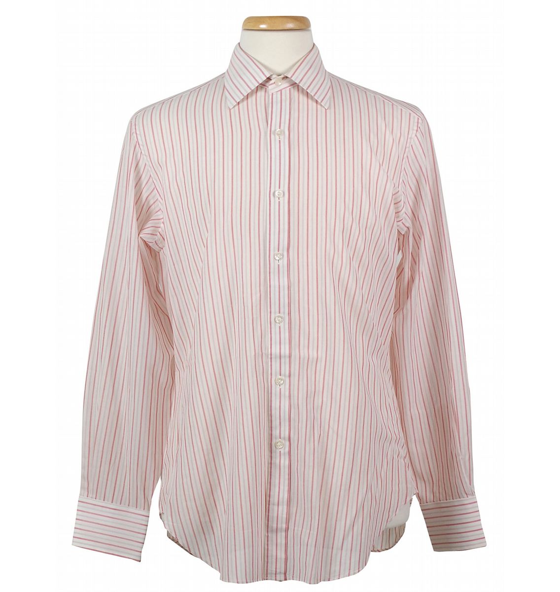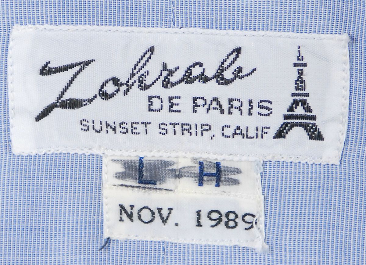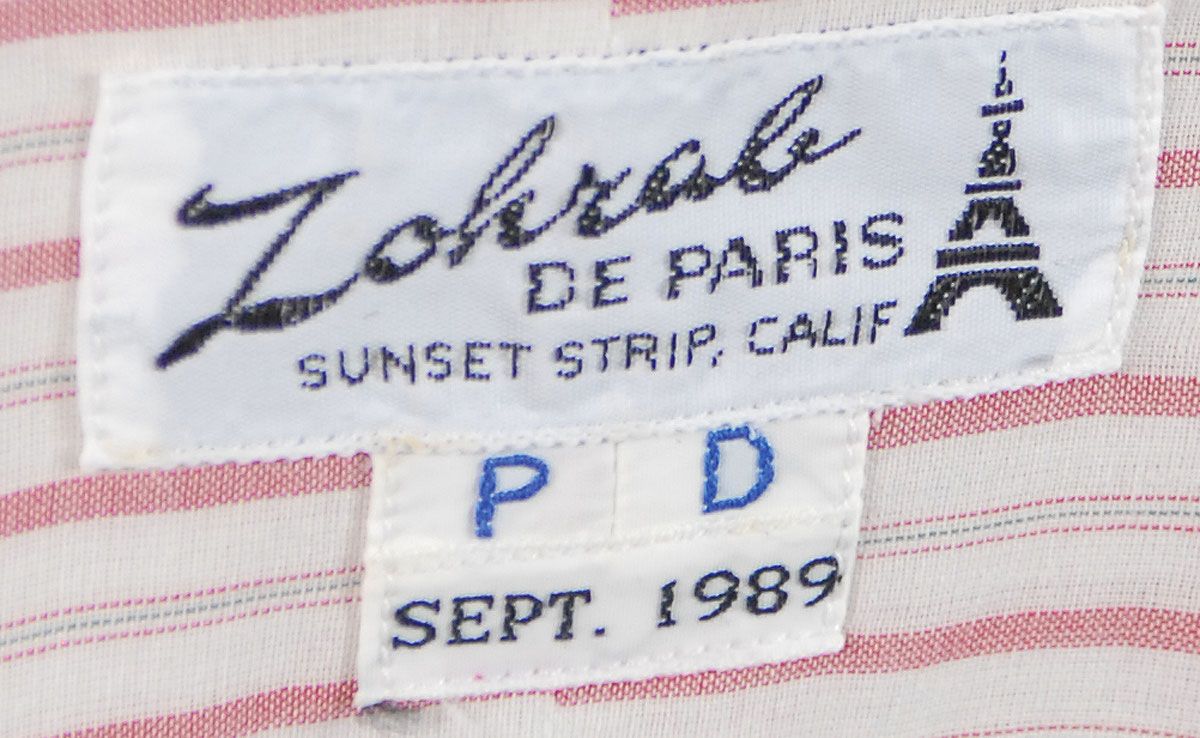 Two shirts worn during the production of the classic television series Dallas. First shirt was worn by Larry Hagman, and is a light blue long-sleeve dress shirt, with a Zohrale de Paris, Sunset Strip, California, maker’s label sewn into the collar, with a small label sewn underneath which reads, “LH, Nov. 1989.” Second shirt was worn by Patrick Duffy, and is a red and white striped dress shirt, also by Zohrale, with a similar label sewn into the collar which reads, “PD, Sept. 1989.” The original manila costumer’s tag is affixed to one the shirt’s buttons. In fine condition. Accompanied by two original TV Guide covers for the show.