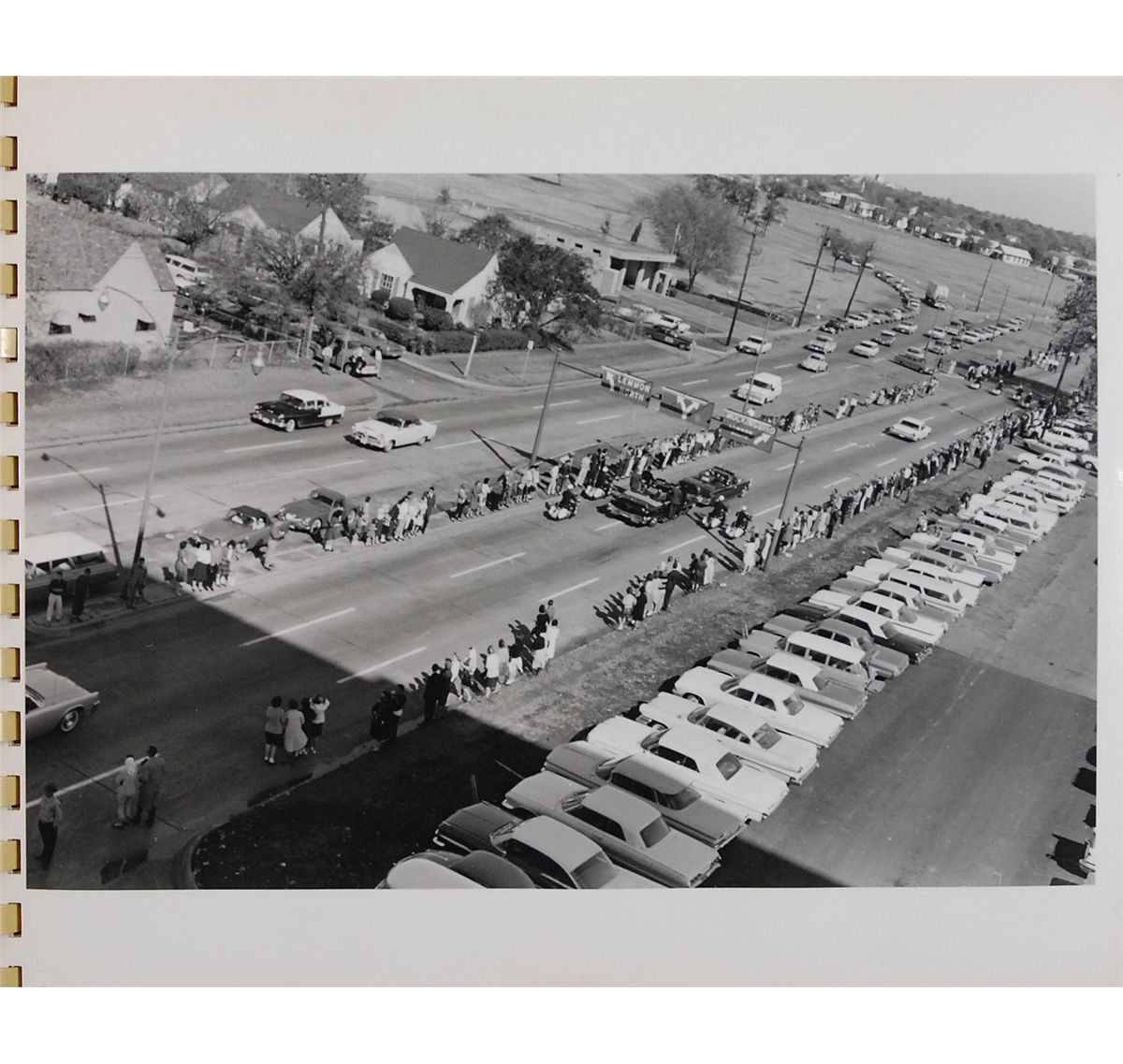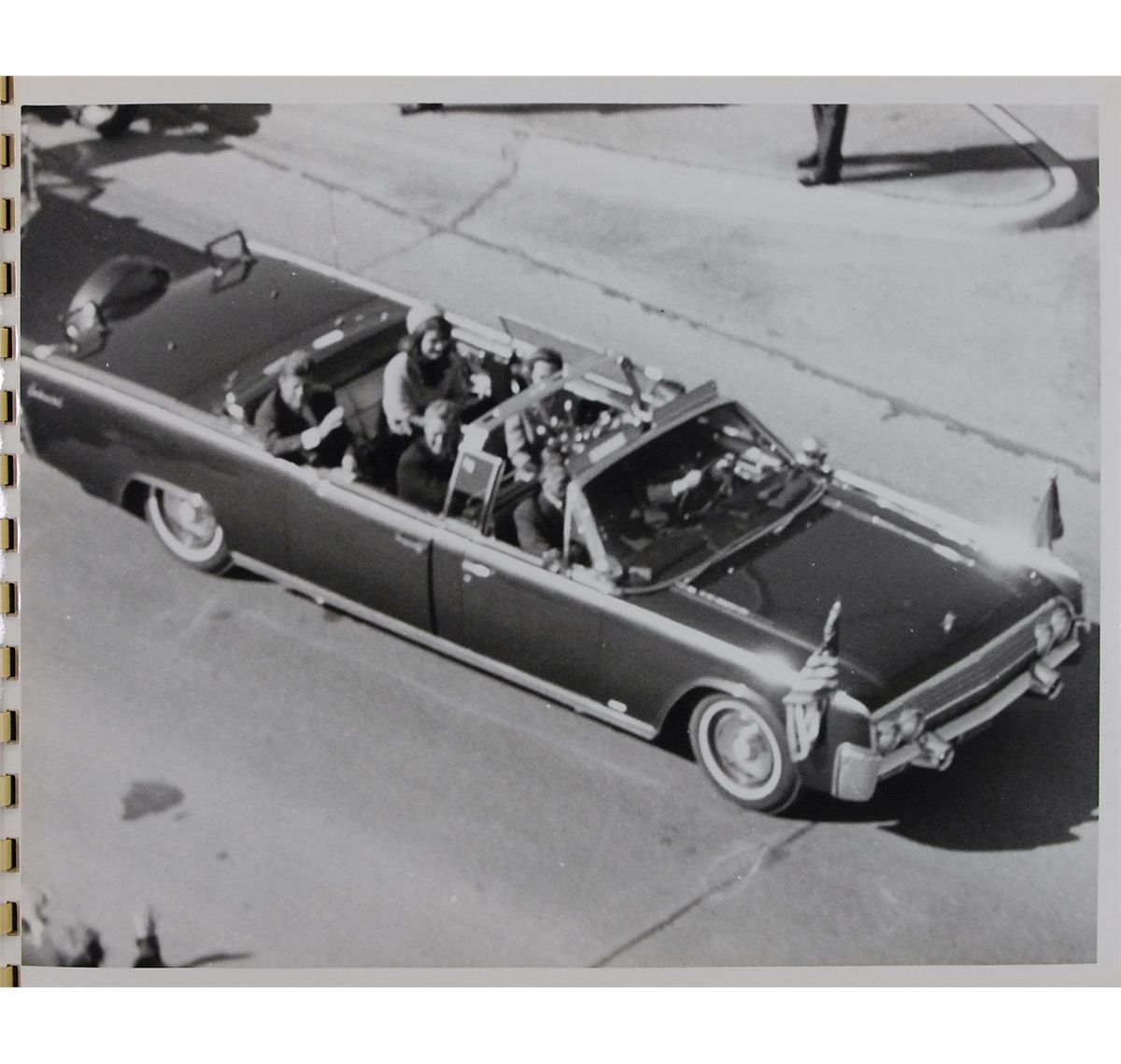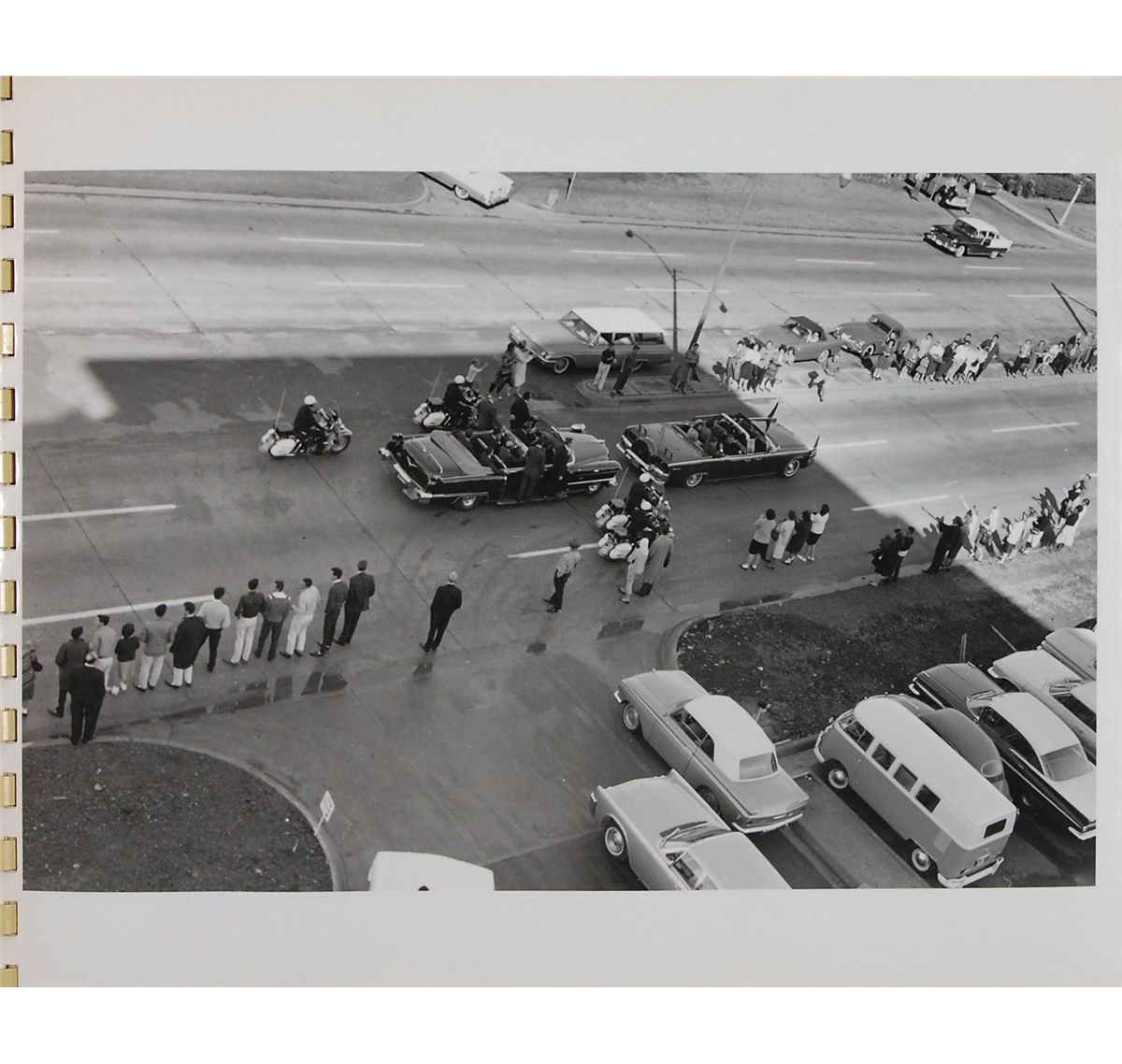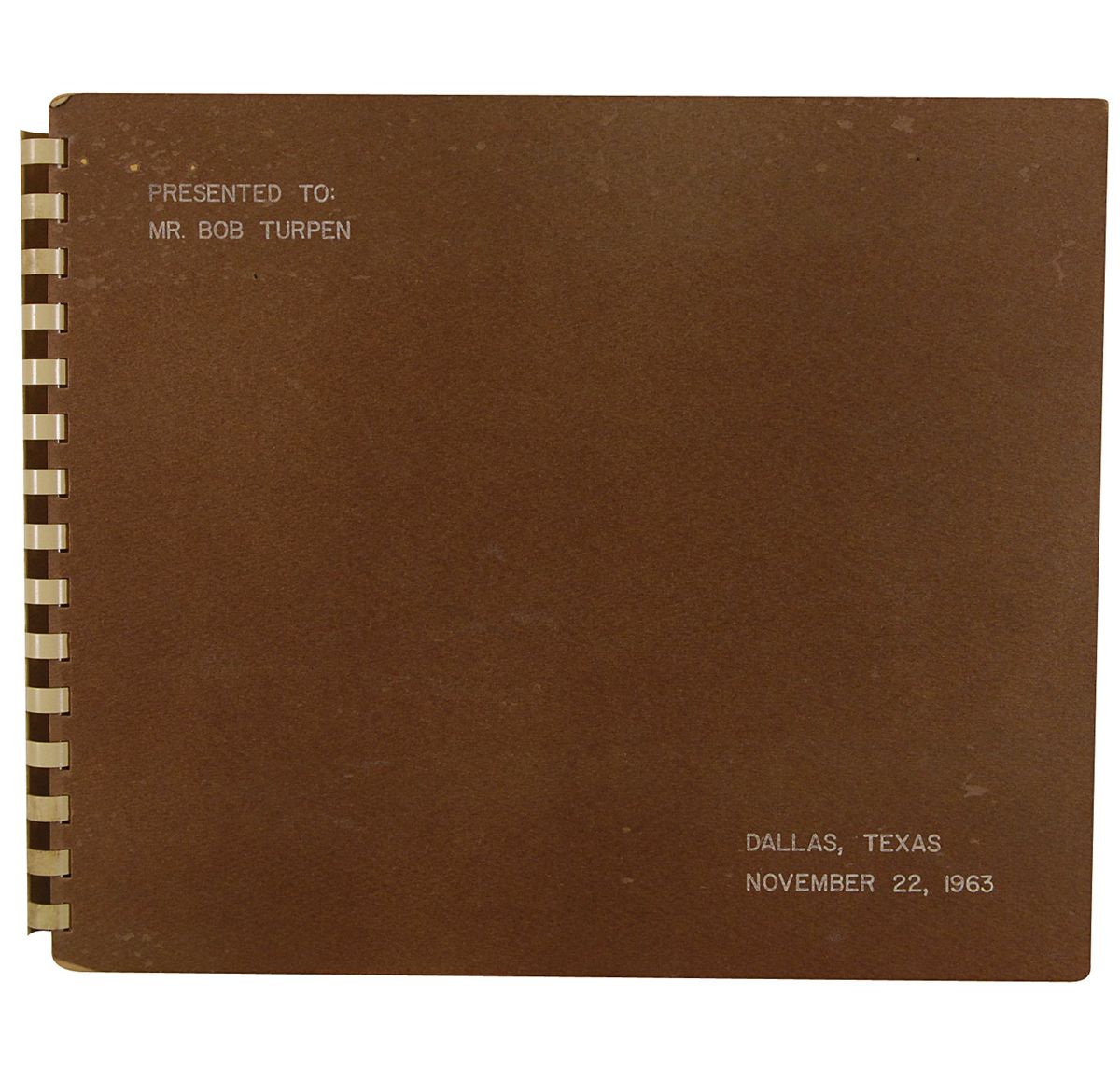 Outstanding vintage photo album presented to Bob Turpen, 11 x 9, bearing presentation lettering on the front identifying the album as, “Dallas, Texas, November 22, 1963.” Album contains 11 laminated photos separated by thin descriptive pages, depicting Kennedy’s and Johnson’s planes approaching and landing at Love Field, the motorcade as it passed Blanton Tower, and close-up images of the presidential limousine. In overall fine condition, with some foxing to descriptive pages. A nice collection of images from a generally unseen portion of the trip.