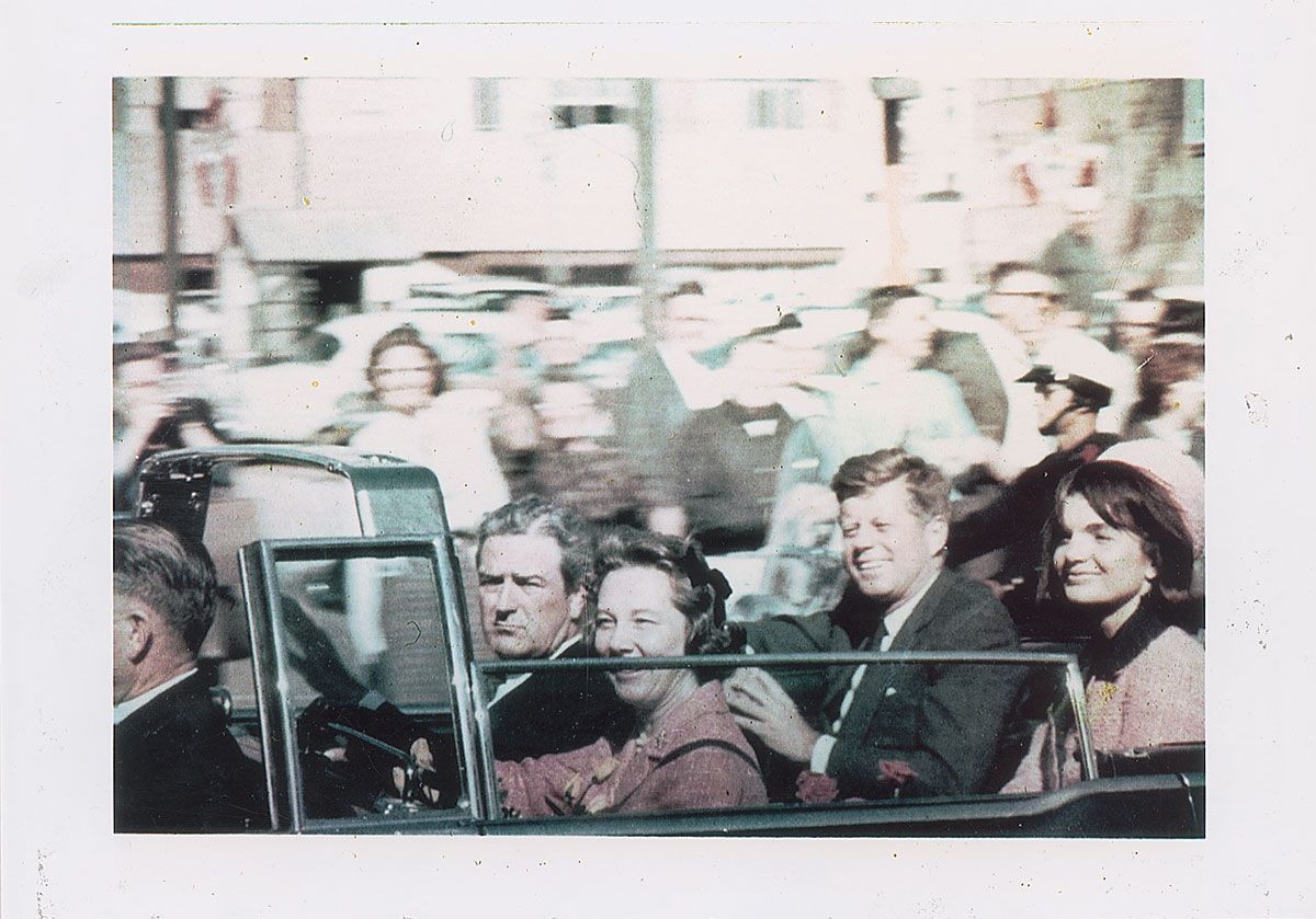 Color glossy 12 x 8 second-generation close-up photo of the Kennedys and the Connallys in their limousine in Dallas on November 22, 1963. Creasing and adhesive remnants to borders and reverse edges, otherwise fine condition.