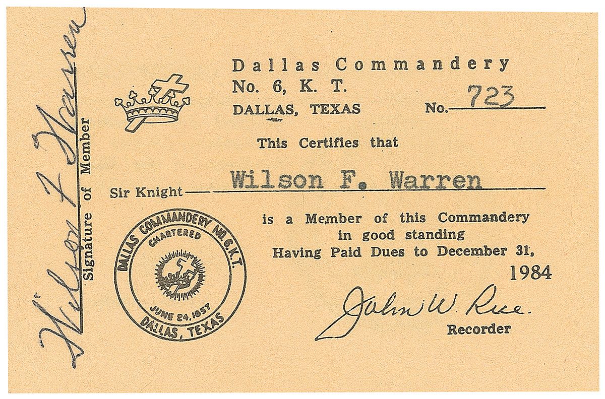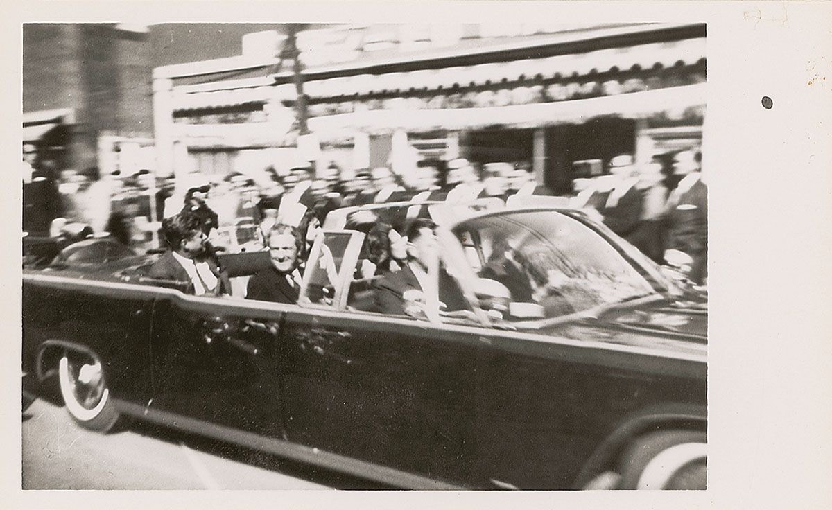 Vintage glossy 8 x 5 photo of Kennedy in the presidential limousine during the Dallas motorcade, originally taken by a member of the general public. In fine condition. During the investigation, the Dallas Police Department asked the public to provide any photos they may have take during the motorcade; these were generally smaller snapshots, which were then enlarged by the police photo lab,as this one is. Originates from the estate of Sgt. Wilson Warren, the officer who booked Oswald when he was brought in. Accompanied by a membership card signed by Warren in black ballpoint.