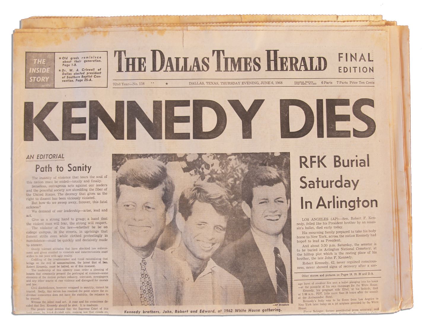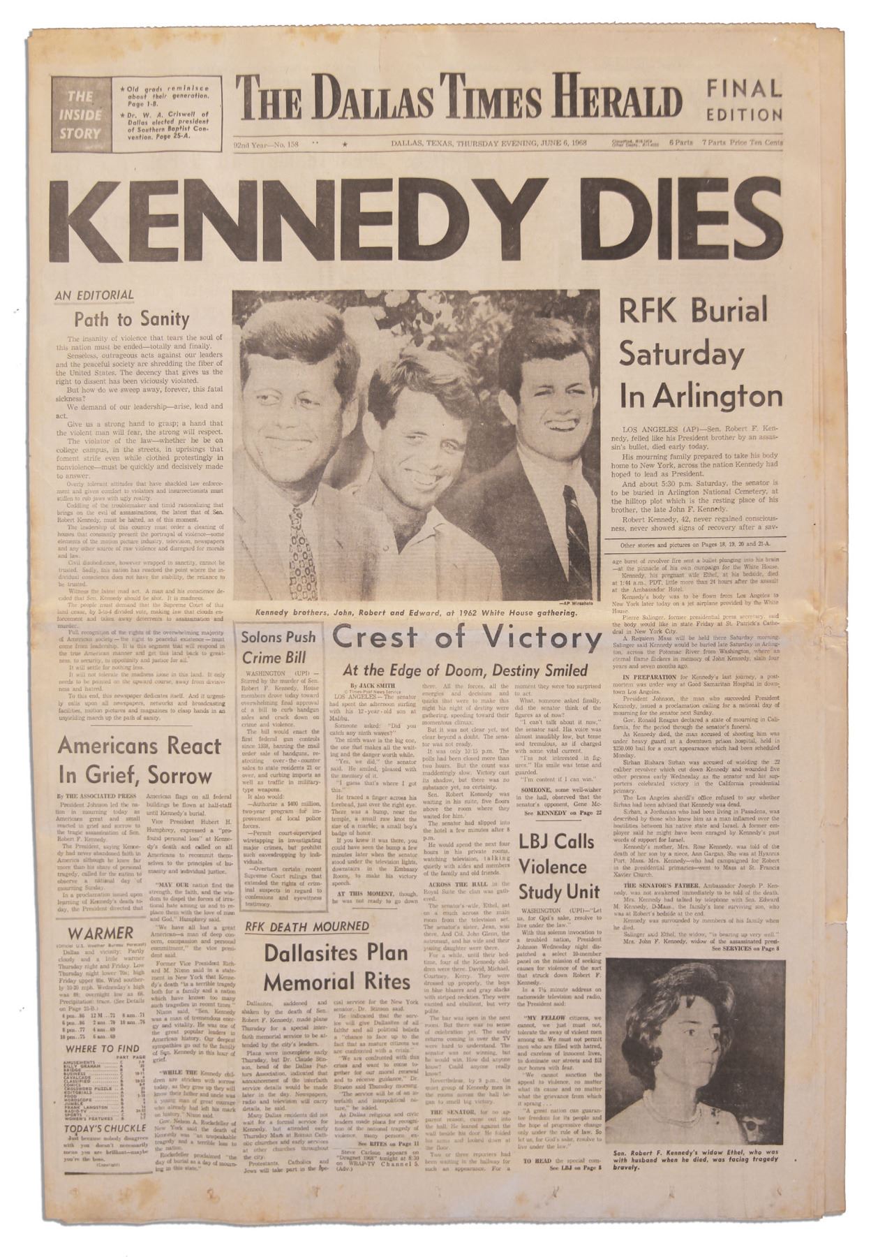 ''Dallas Times Herald'' 6 June 1968 ''final edition'' newspaper, printed the day after RFK was shot at the Ambassador Hotel in Los Angeles. Headline reads ''Kennedy Dies / RFK Burial Saturday in Arlington'' and front-page articles discuss Sirhan Sirhan as the alleged gunman. Subsequent articles detail the shock and sorrowful sentiments of the nation. Section 1 only of 7 part paper runs 24pp., with toning throughout and minor tears to right edge. Very good condition.