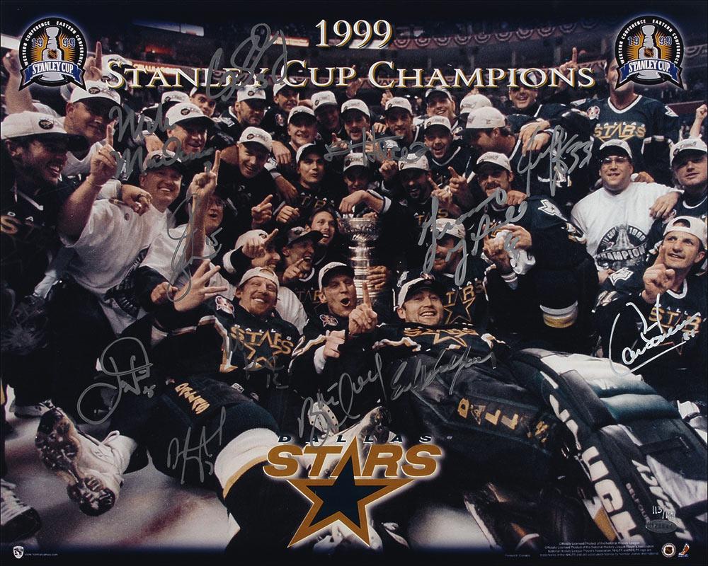 Limited edition color 20 x 16 photo of the 1999 Stanley Cup Champion Stars, #113/199, signed in silver ink by 13 players, including: Brett Hull, Mike Modano, Joe Nieuwendyk, Ed Belfour, Derian Hatcher, Benoit Hogue, Jamie Langenbrunner, Mike Keane, Grant Marshall, Guy Carbonneau, Darryl Sydor, and Craig Ludwig. In fine condition. Pre-certified Steve Grad/PSA/DNA and RRAuction COA.