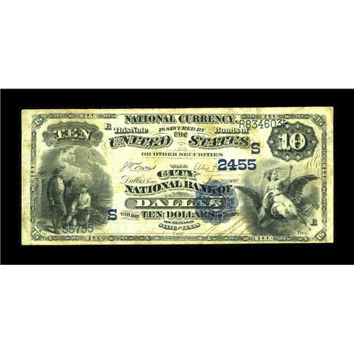 <B>Dallas, TX</B></I> - $10 1882 Date Back Fr. 545 <B>The City NB</B></I> Ch. # (S)2455<BR>This <B>Fine</B></I> $10 Second Charter Date Back is nicely margined and has a radar serial number. While this is by no means a scarce bank, this type and denomination from here are quite elusive. <B>Fine.</B></I><BR><BR><b>Shipping:</b> Coin/Currency (<a target="_blank" href="http://www.heritageauctions.com/common/shipping.php">view shipping information</a>)