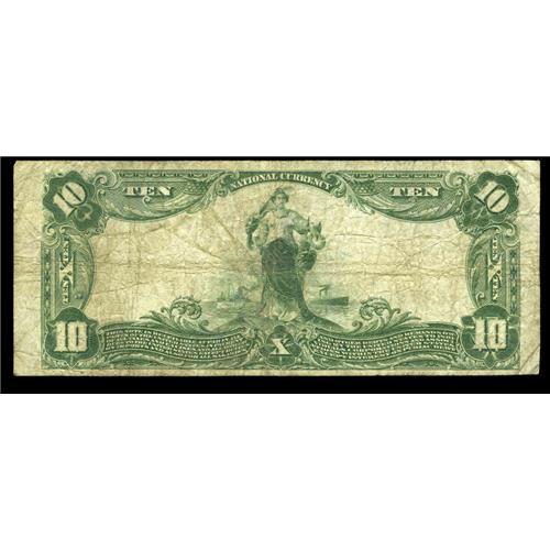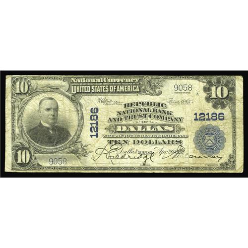 <B>Dallas, TX</B></I> - $10 1902 Plain Back Fr. 635 <B>Republic NB & TC</B></I> Ch. # 12186<BR>This $10 from charter number 12186 is from the rare second bank title with the added trust designation. This title was not adopted until July 1928, only one year before the debut of Small Size paper money. The census holds only three serial numbers for this title, as compared to 45 serial numbers for the first bank title. The census does not include this note with the printed signatures of R(upert) Eldridge and F(red) F. Florence. <B>Very Good+++.</B></I>