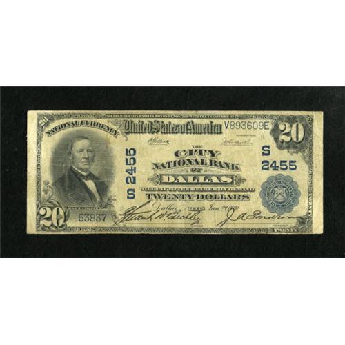 <B>Dallas, TX</B></I> - $20 1902 Plain Back Fr. 659 <B>The City NB</B></I> Ch. # (S)2455<BR> Though a trifle flat, the paper is solid. <B>Very Good-Fine.</B></I><BR><BR><b>Shipping:</b> Coins & Currency (<a target="_blank" href="http://www.heritageauctions.com/common/shipping.php">view shipping information</a>)