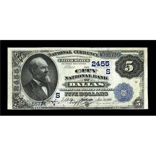 <B>Dallas, TX</B></I> - $5 1882 Date Back Fr. 537 <B>The City NB</B></I> Ch. # (S)2455<BR>An attractive high grade Second Charter example. The bottom margin is a bit tight, but the broad top margin helps considerably. This piece brought $1150 when we sold it back in January of 2003, and will likely fetch more this evening. Sharp <B>Very Fine-Extremely Fine.</B></I><BR><BR><b>Shipping:</b> Coins & Currency (<a target="_blank" href="http://www.heritageauctions.com/common/shipping.php">view shipping information</a>)