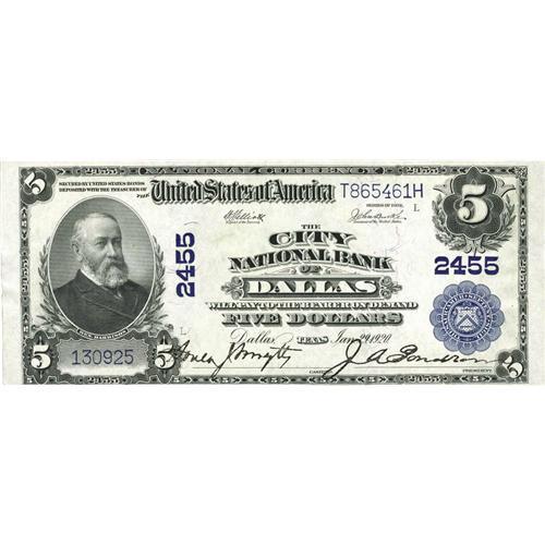 <B>Dallas, TX</B></I> - $5 1902 Plain Back Fr. 607 <B>The City NB</B></I> Ch. # 2455<BR>This piece was last sold in our 2005 Central States Signature Sale where is was described, "A bright and pack-fresh <B>Choice Crisp Uncirculated</B></I> example from a state with uncirculated Nationals in short supply. A bright and striking note with darkly stamped officers' signatures still as strong as the day they were applied to the sheet." The market now is quickly grabbing up original uncirculated nationals, so expect more bidding this time around.