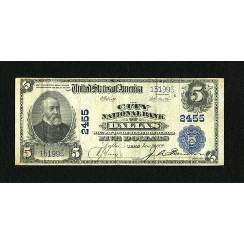 <B>Dallas, TX</B></I> - $5 1902 Plain Back Fr. 607 <B>The City NB</B></I> Ch. # 2455<BR> This note is in the census, but without a grade. Now, the census takers can finally catch up with it again. This attractive mid-grade example has printed signatures. <B>Fine-Very Fine.</B></I><BR><BR><b>Shipping:</b> Coins & Currency (<a target="_blank" href="http://www.heritageauctions.com/common/shipping.php">view shipping information</a>)
