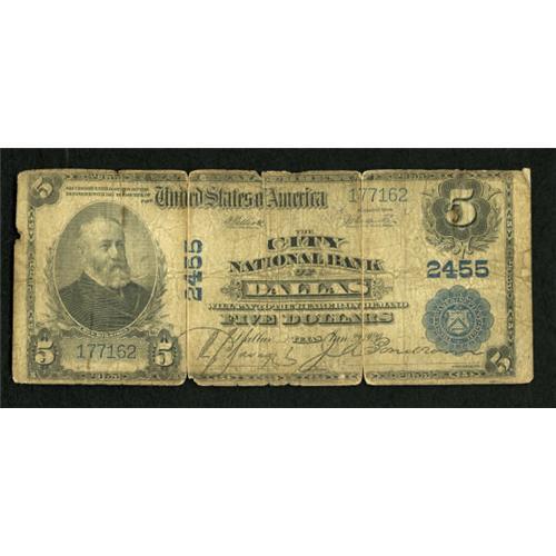 <B>Dallas, TX</B></I> - $5 1902 Plain Back Fr. 607 <B>The City NB</B></I> Ch. # 2455<BR> This note was folded into thirds and then stored in a wallet. This produced some edge splits with the longest being approximately a half an inch. <B>Good.</B></I><BR><BR><b>Shipping:</b> Coins & Currency (<a target="_blank" href="http://www.heritageauctions.com/common/shipping.php">view shipping information</a>)