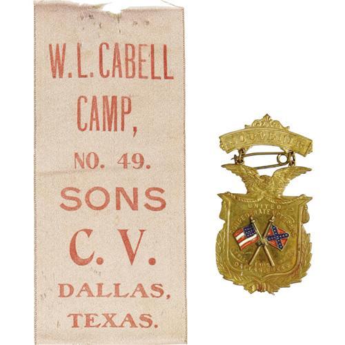 <B>Dallas, Texas U.C.V. and Sons C.V. Memorabilia Circa 1902.</B></I> The United Confederate Veterans was formed in 1889 as a veteran's association for former Confederate soldiers in the American Civil War, similar in purpose and scope to the Grand Army of the Republic group for Union soldiers. The UCV organized many local and national reunions of Confederate veterans, often in conjunction with GAR reunions. Medals and ribbons were often produced as souvenirs of these gatherings and we offer collectors two fine Dallas-related items. The medal (1.25" x 2.375") was produced for the UCV reunion held in Dallas in 1902 and is a particularly attractive one with both the American and Confederate flags pictured in colored enamel. The condition is excellent, the only flaw being that the pin has come unsoldered at the top; it is still present though and easily repaired. <BR><BR>The ribbon, 2" x 4.5" in size, was issued, possibly at the same time, by the Sons of the Confederate Veterans, a fraternal organization organized under the auspices of the UCV in 1896 for male descendants of soldiers who fought honorably for the Confederate States of America during the Civil War, and which is still active today. This silk ribbon is in near-excellent condition and states in red "W. L. Cabell Camp, No. 49. Sons C.V. Dallas, Texas." This is the name of the Dallas camp or chapter to this day. General William Lewis Cabell was a brigadier general in the CSA and later served as the mayor of Dallas for three non-consecutive terms in the 1870s and 1880s.