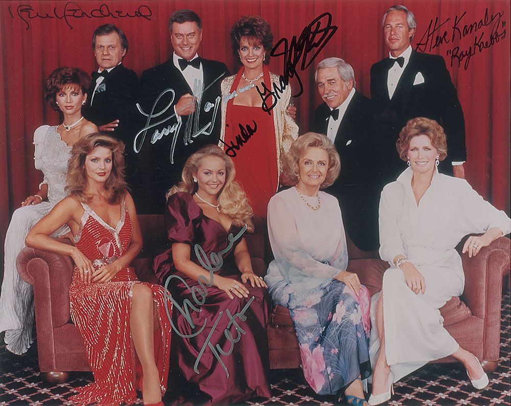 Color glossy 10 x 8 photo of the Dallas cast, signed in felt tip and ink by Larry Hagman, Charlene Tilton, Linda Gray, Steve Kanaly, Ken Kercheval, and Howard Keel. In fine condition.