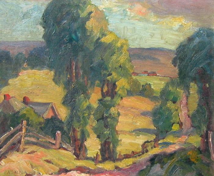 ERNEST ALFRED DALTON AOCA (Canadian 1887 - 1963 ) Farm Landscape Oil on panel 10" x 12" (25.4 x 30.48cm.) Signed lower left