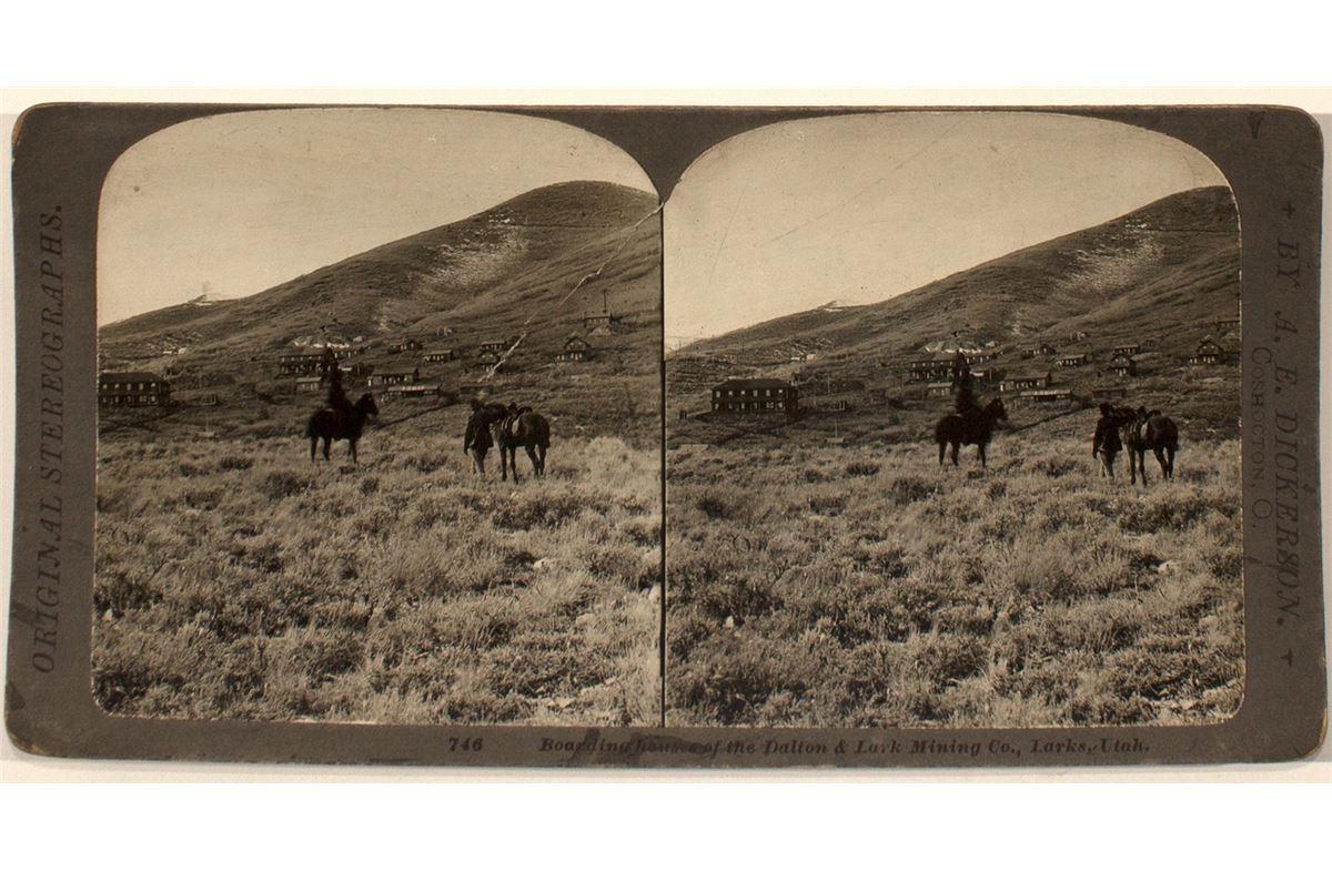Rare view! No 746. Boarding Houses of the Dalton & Lark Mining Co., Larks, Utah. Published by A.E. Dickerson, Coshocton, Ohio. View of two men on horseback with houses and mine on hill in background. Crease/rip going through left panel. Dickerson was active from the late 1880s to about 1910. The Dalton & Lark Mining Co. was a consolidation of 16 claims completed in 1895. The company became part of Bingham Mines Co. in Bingham Canyon, Salt Lake County. Lands are circa 500 acres, including the Dalton & Lark and Commercial mines, on the west side of Bingham Canyon, and the Mascotte mine, these being the principal properties…. The Dalton & Lark mine, area 240 acres, has shafts of 850’ and 1150,’ with 4 tunnels…extraction being exclusively by tunnel. The Dalton & Lark vein on the 11th level averages about 6’ width, carrying about 2% copper, 6 oz. silver and $1.50 gold per ton…The lead ores of the Dalton & Lark are richer than the copper ores, as a rule. The mine is claimed to have about 250,000 tons of medium grade and 500,000 tons of low grade ore in sight. The Mascotte mine, area 160 acres, has the Mascotte tunnel of circa 7,000’ length, which drains the Dalton & Lark…providing extraction only. The D & L was dissolved by order of court in 1911. [Ref: Copper Hndbk, 1908, pp.372-3; 1918, p. 78]. (Prag Collection)