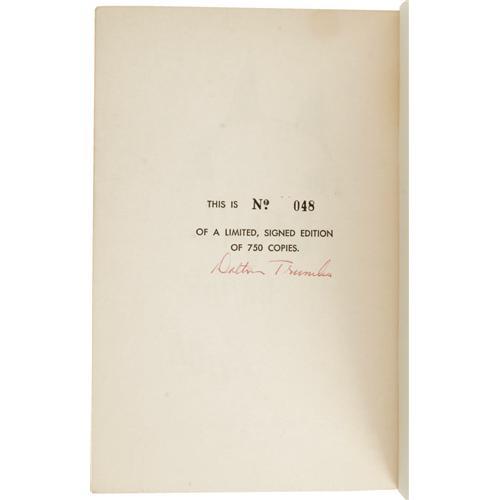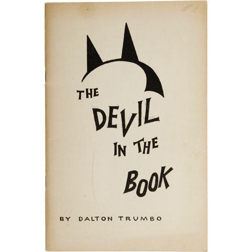 <B>Dalton Trumbo Signed Book.</B></I> The most famous writer of the Blacklist era's "Hollywood Ten," three-time Academy Award winner Trumbo (1905-1976) - who said famously of that tragic time,"There were no heroes or villains, only victims" - wrote <I>The Devil in the Book,</B></I> an examination of the Smith Act and the suppression of free speech, published in 1956. The California Emergency Defense Committee published a limited run of 750 copies of this 42-page paperback book; this is no. 48, and Trumbo signed the inside cover in full and in red ink. The book measures 5.5" x 8.5," has some cover wear and staining, with Trumbo's signature clean and neat. This is a very book and especially desirable form for a writer famous both cinematically and politically. Very Fine condition. <I>Accompanied by LOA from PSA/DNA.</B></I><BR><BR><b>Shipping:</b> Flat Material, Small (<a target="_blank" href="http://www.heritageauctions.com/common/shipping.php">view shipping information</a>) <BR><BR><B>Important notic