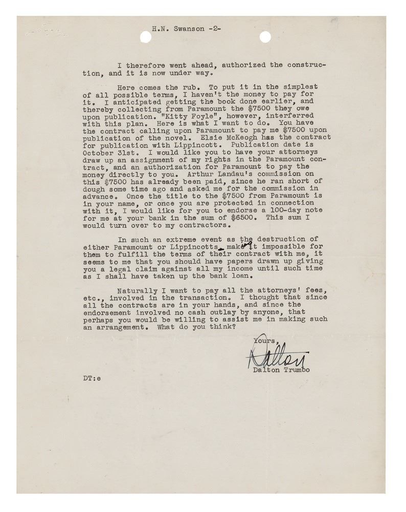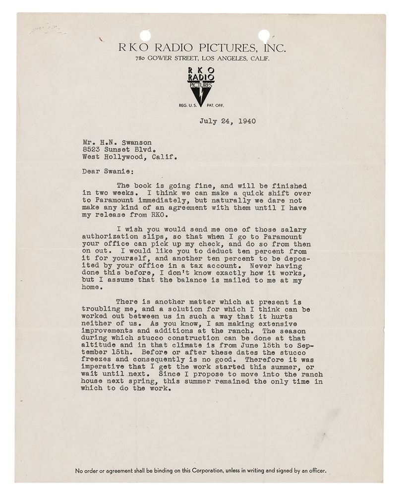 TLS signed "Dalton," two pages, 8.5 x 11, RKO Radio Pictures letterhead, July 24, 1940. Letter to his literary agent, H. N. Swanson, in part: "The book is going fine, and will be finished in two weeks. I think we can make a quick shift over to Paramount immediately, but naturally we dare not make any kind of an agreement with them until I have my release from RKO…As you know, I am making extensive improvements and additions at the ranch. The season during which stucco construction can be done at that altitude and in that climate is from June 15th to September 15th. Before or after these dates the stucco freezes and consequently is no good. Therefore it was imperative that I get the work started this summer…Here comes the rub. To put it in the simplest possible terms, I haven't the money to pay for it. I anticipated getting the book done earlier, and thereby collecting from Paramount the $7500 they owe upon publication. 'Kitty Foyle,' however, interfered with this plan. Here is what I want to do. You have the contract calling upon Paramount to pay me $7500 upon publication of the novel. Elsie McKeogh has the contract for publication with Lippincott. Publication date is October 31st. I would like you to have your attorneys draw up an assignment of my rights in the Paramount contract, and an authorization for Paramount to pay the money directly to you…I would like for you to endorse a 100-day note for me at your bank in the sum of $6500. This sum I would turn over to my contractors." In fine condition.