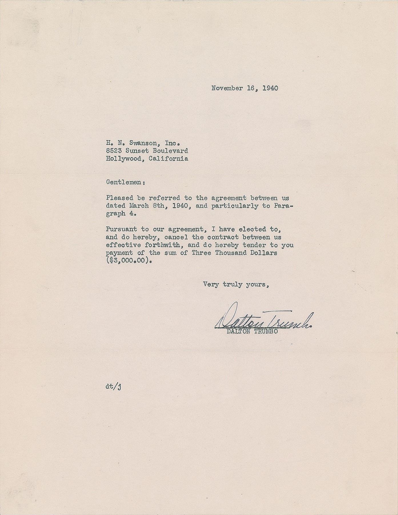 Academy Award-winning screenwriter (1905-1976) of such films as Spartacus, Exodus, and Papillon who attained worldwide notoriety as a member of the blacklisted 'Hollywood Ten.' DS, one page, 8.5 x 11, November 16, 1940. Official letter addressed to H. N. Swanson, Inc., in full: "Please be referred to the agreement between us dated March 8th, 1940, and particularly to Paragraph 4. Pursuant to our agreement, I have elected to, and do hereby, cancel the contract between us effective forthwith, and do hereby tender to you payment of the sum of Three Thousand Dollars ($3,000.00)." Signed at the conclusion by Trumbo. In fine condition.