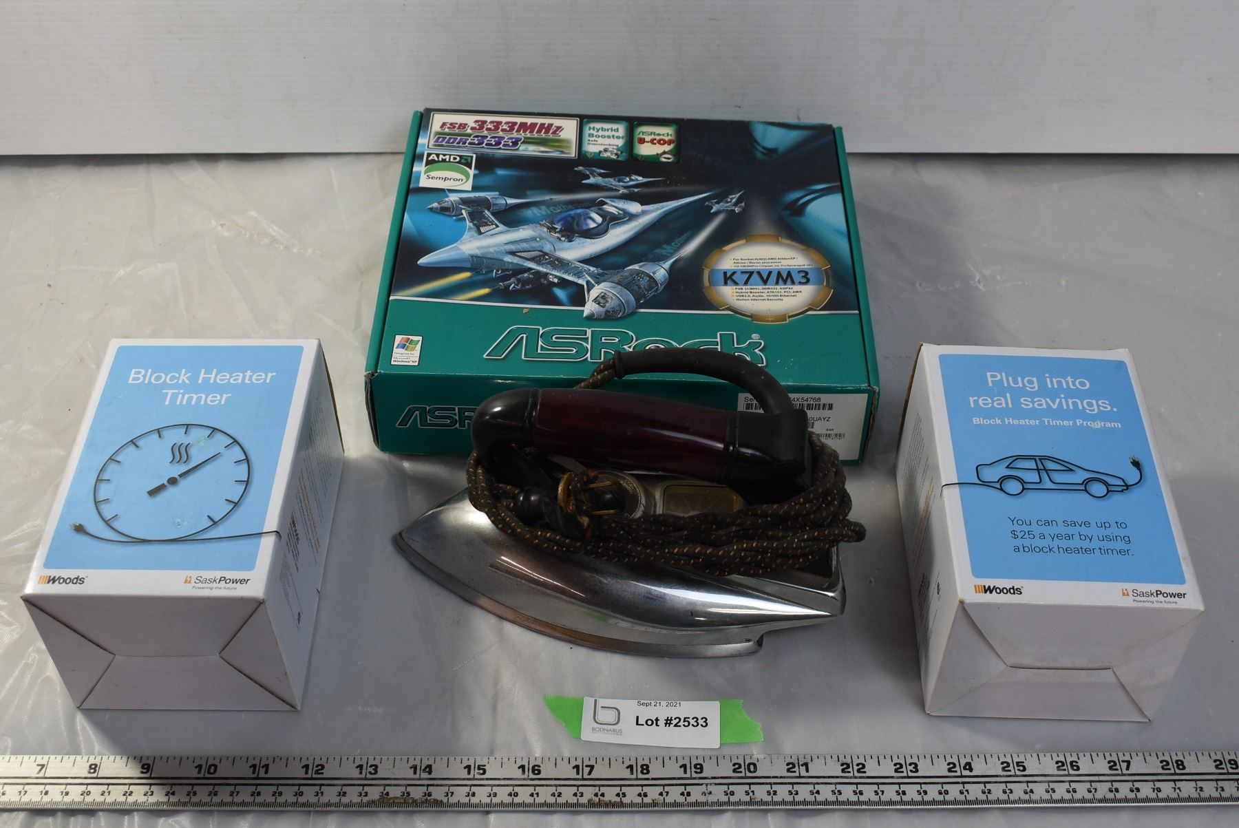 Damaged mortherboard and HDD, 2 Blockheater timers, Vintage iron