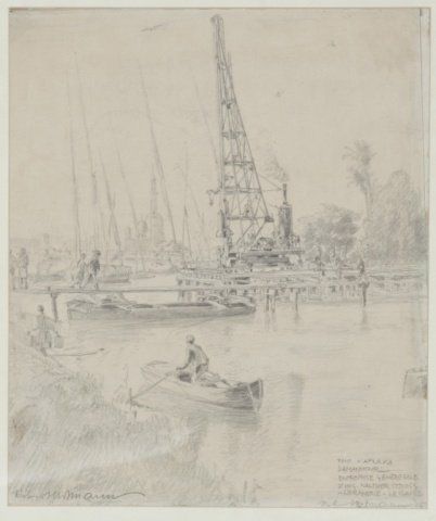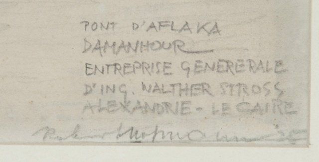 Egyptian waterway scene. Pencil on paper. Signed illegibly at l.l. Additional inscription at l.r., "Pont D'Aflaka/Damanhour/Enterprise Generale/D'Inc. Walther Stross/Alexandrie-Le Caire/signed illegibly". Framed and matted under glass. Sight: 11 1/2" x 10". Frame: 17 1/2" x 16".
