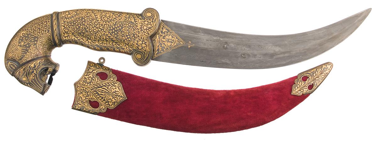 Curved double edged blade, measuring 9 1/2" long and 1 3/4" wide at the base, with 1 3/4" tall triangular areas of gold scroll and vine inlay on either side next to the grip. Iron hilt with extensive gold wire inlay, showing scroll and vine designs overall, untranslated symbols on either side of the main body, a howling animal head on either side of the pommel, with the pommel itself shaped as a roaring lion with gold details. OAL: 15 1/2". Red felt covered wood sheath, with multicolored wire on the rear seam and gold inlaid throat and tip.