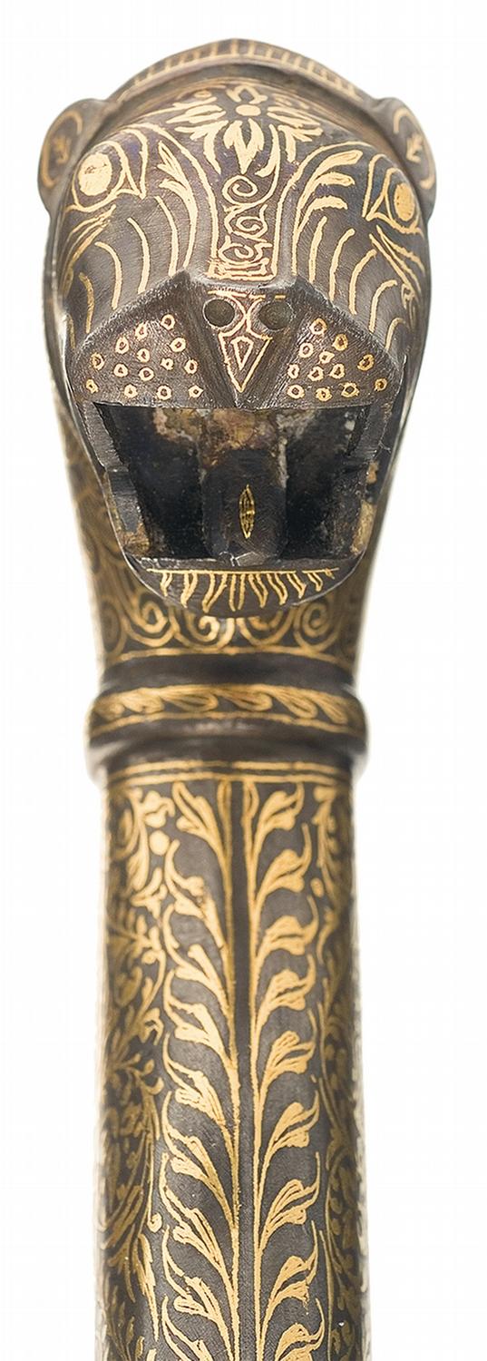Condition: Fine, with a clear Damascus pattern on the blade, a fine dark patina on the hilt and sheath fittings, minimal sheath wear and excellent gold inlay.