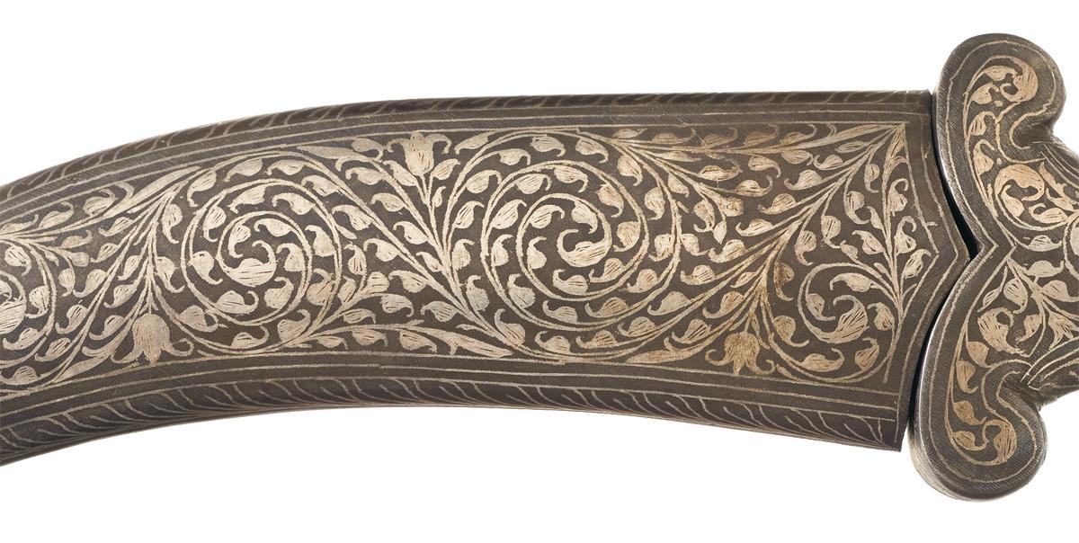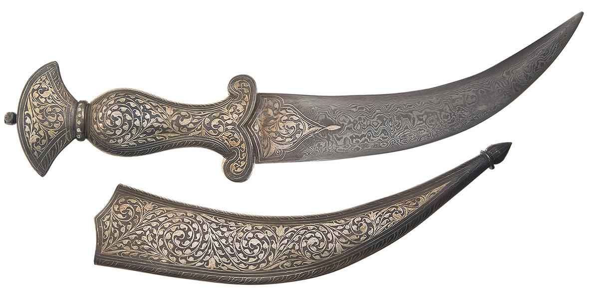6 1/8" long Damascus steel blade, with a 1 1/2" long section of silver wire inlaid leafy vine engraving on each side near the hilt. The hilt and sheath are both steel, with a flared pommel, red felt lining and a similar pattern of vine inlay on both. OAL: 10"