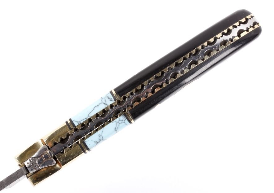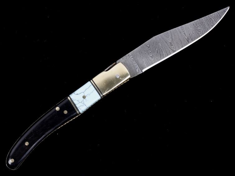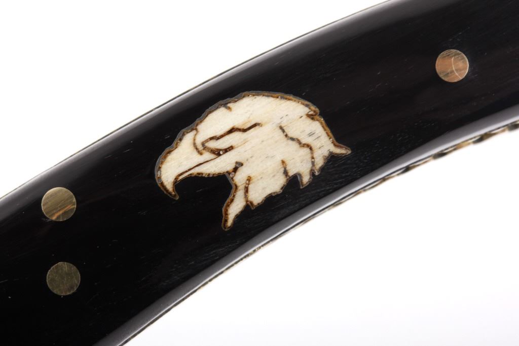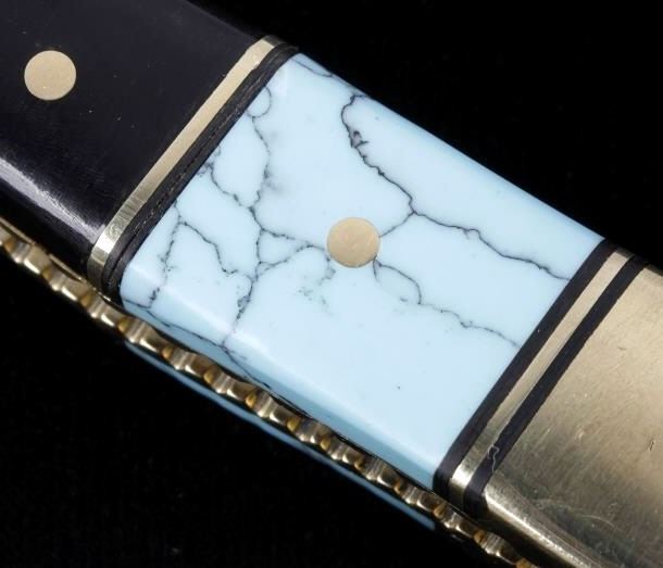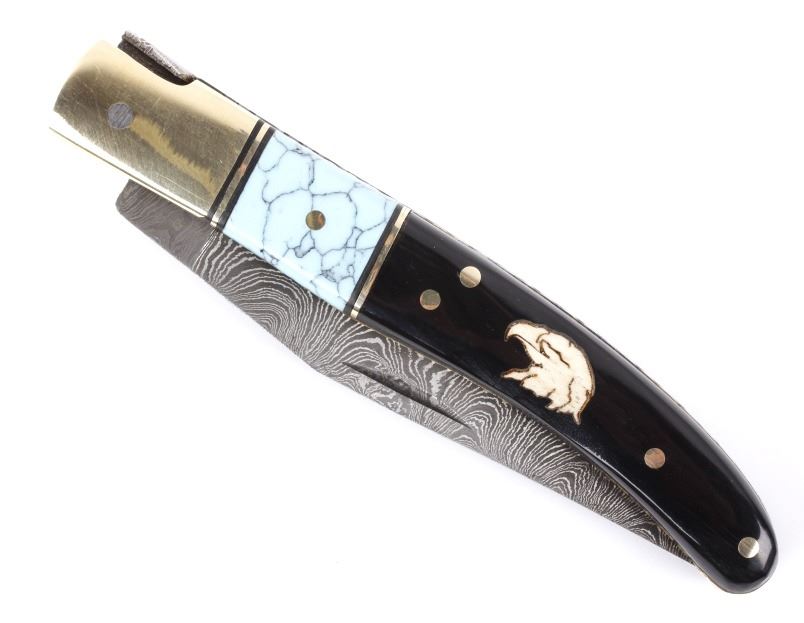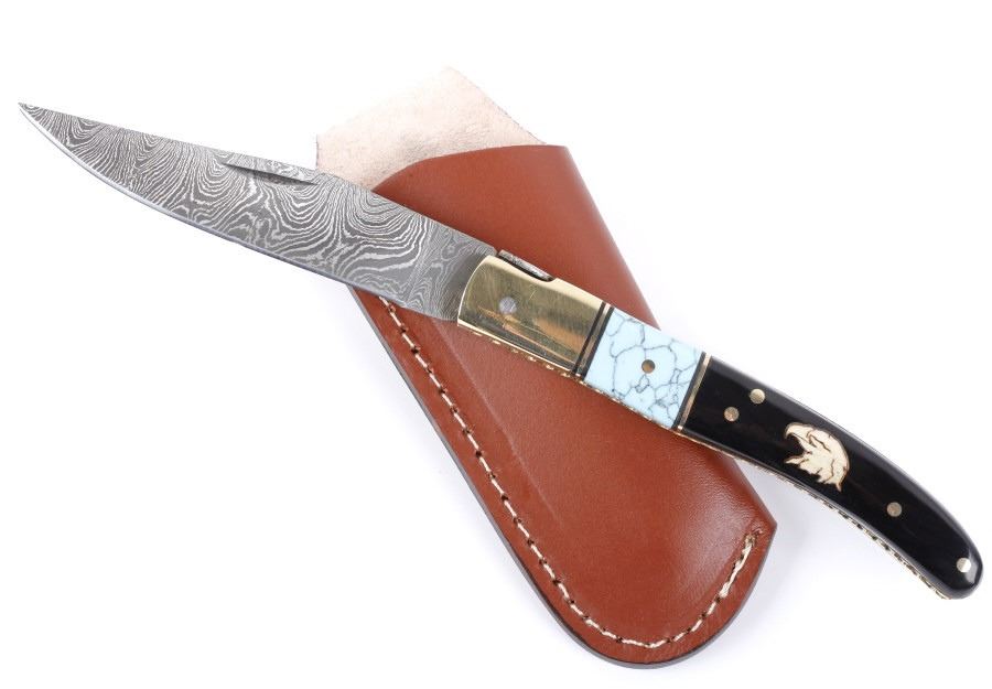 For your consideration in this lot is a custom inlaid knife and leather scabbard, hand crafted by Dan Gwynn from Hamilton, Montana. The knife shows deep black buffalo horn handles, with an intricate eagles head inlaid into the grip. Further decorating the handle, is a large polished chunk of gem quality Kingman Spiderweb turquoise on each side, with decorative brass inserts flanking the turquoise on the top and bottom. In addition to the ornate handle, the knife utilizes a brass bolster, with a heavy-duty steel pivot rivet. When closed the Damascus drop-point blade is housed safely between hand tooled scalloped bolster lining, also crafted of fine brass. Finishing off the beautiful knife, is an intricate tooled spine. Dan Gwynn learned the art of inlay at the early age of 12, when his father Ed Gwynn made a point of instilling the values of hard work, and integrity into his children - Dan continues the tradition nearly 40 years later by teaching his two daughters and his wife the ways of the Gwynn business. This knife shows very good - unused condition. When opened, the knife measures 8 3/8" long, with a 3 7/8" blade.