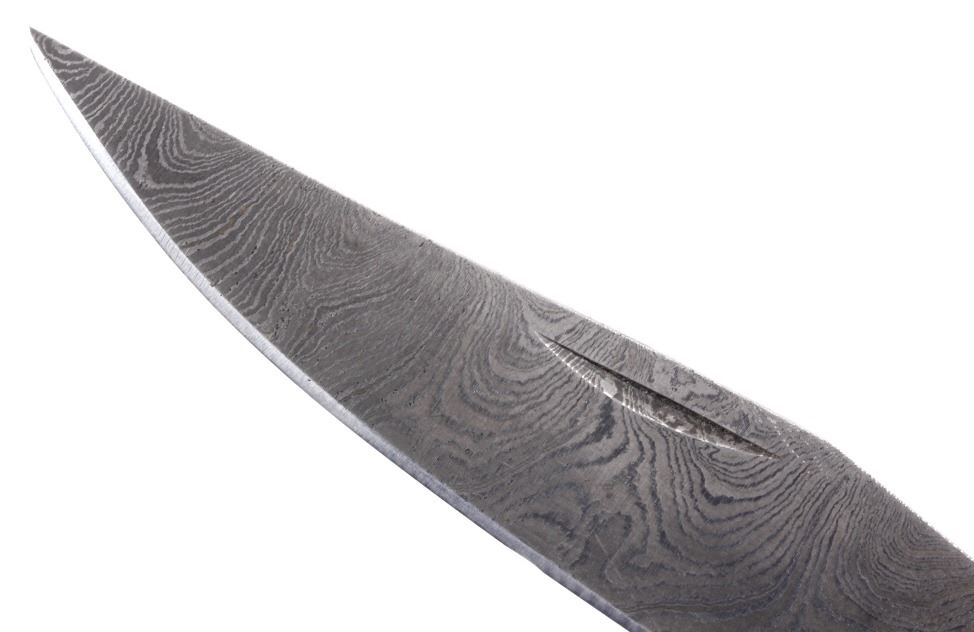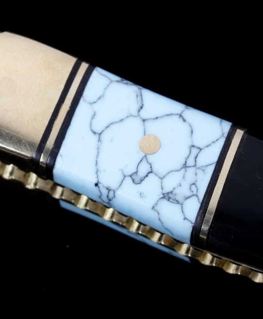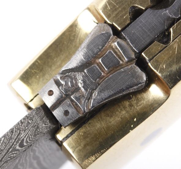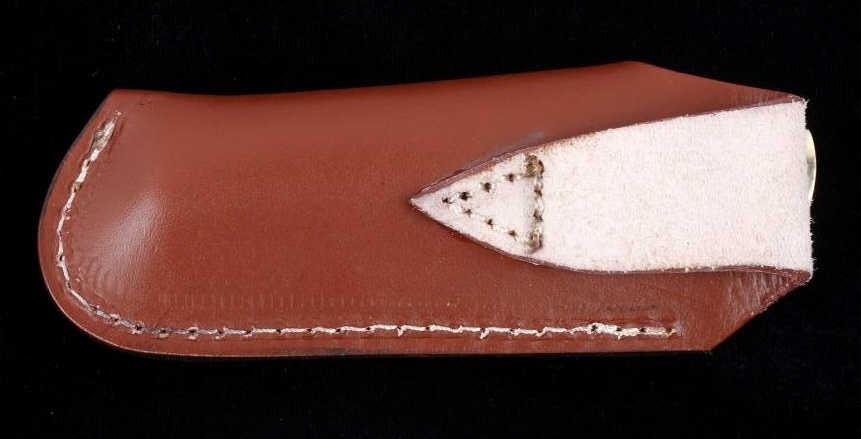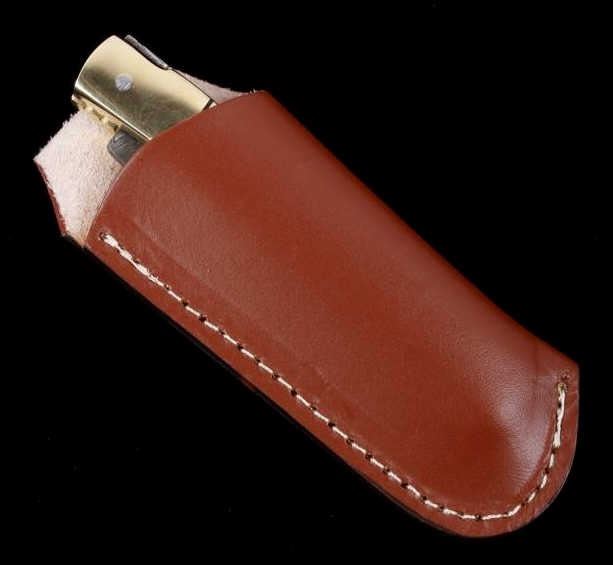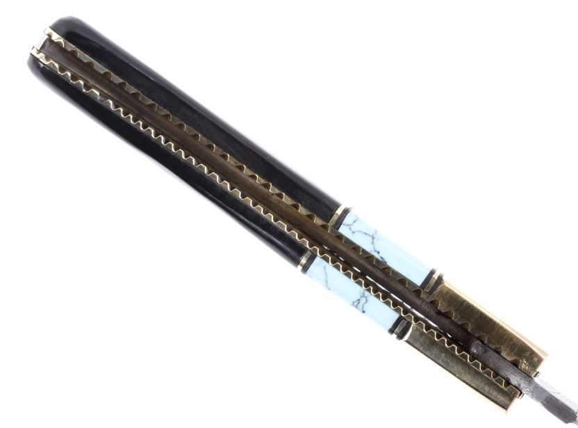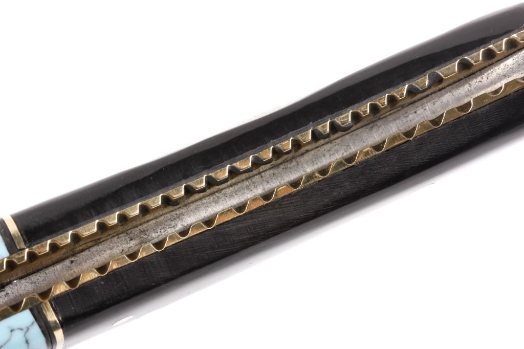 For your consideration in this lot is a custom inlaid knife and leather scabbard, hand crafted by Dan Gwynn from Hamilton, Montana. The knife shows deep black buffalo horn handles, with an intricate eagles head inlaid into the grip. Further decorating the handle, is a large polished chunk of gem quality Kingman Spiderweb turquoise on each side, with decorative brass inserts flanking the turquoise on the top and bottom. In addition to the ornate handle, the knife utilizes a brass bolster, with a heavy-duty steel pivot rivet. When closed the Damascus drop-point blade is housed safely between hand tooled scalloped bolster lining, also crafted of fine brass. Finishing off the beautiful knife, is an intricate tooled spine. Dan Gwynn learned the art of inlay at the early age of 12, when his father Ed Gwynn made a point of instilling the values of hard work, and integrity into his children - Dan continues the tradition nearly 40 years later by teaching his two daughters and his wife the ways of the Gwynn business. This knife shows very good - unused condition. When opened, the knife measures 8 3/8" long, with a 3 7/8" blade.