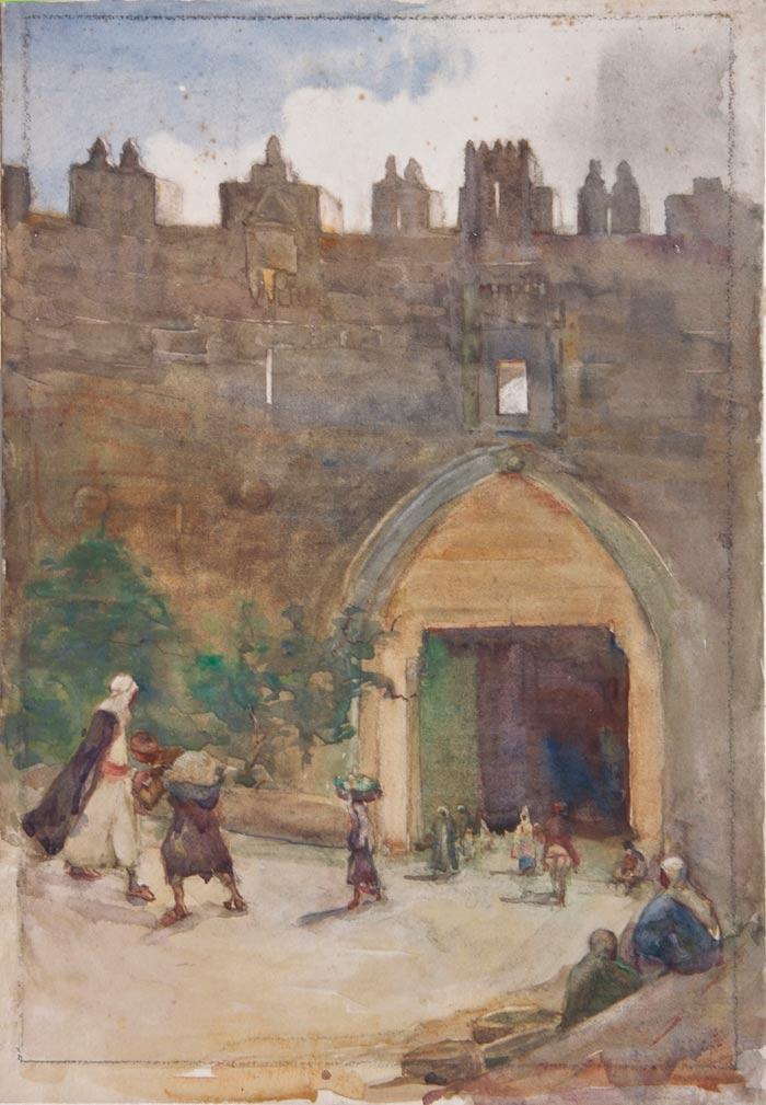 Hilda May Gordon (1874-1972). British archaeologist and painter. Studied under Frank Brangwyn and Sir Hubert von Herkomer at the Bushy School of Art and joined Brangwyn on a painting trip to Italy in 1900. A significant part of her paintings consists of tens of aquarelles painted in Palestine around the year 1900. Although inspired by the Orientalist academic trend, some individual shades can be traced in Hilda May Gordon's small paintings, in particular her tendency towards the light cloudy shade, and her remote view which is always one of a curious but cautious tourist.She set off travelling for a few months in 1922 and ended up going on a trip around the world, which lasted six years. During this time she visited India, Kashmir, Tibet, Burma, Thailand, Indonesia, China and Japan and produced a large body of watercolour paintings - the product of her keen ability to render people and the atmosphere of exotic places in colourful compositions.