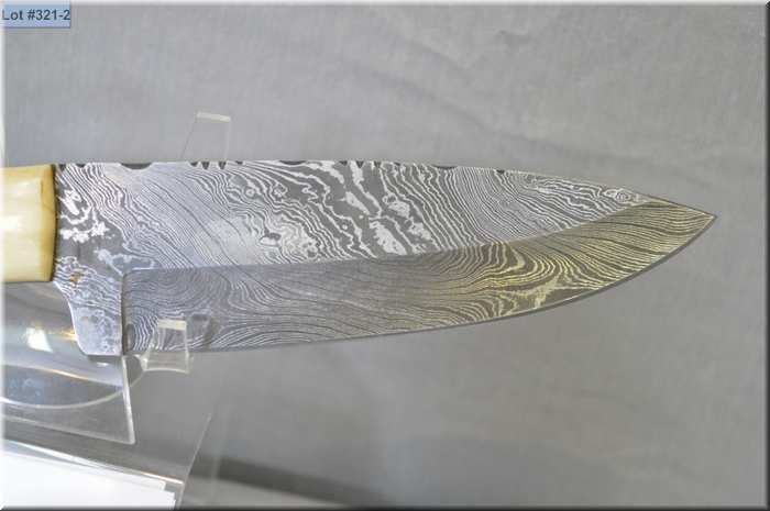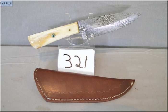 Damascus Hand Forged Hunting Knife w/ bone style handle, w/5" blade, w/ leather sheath