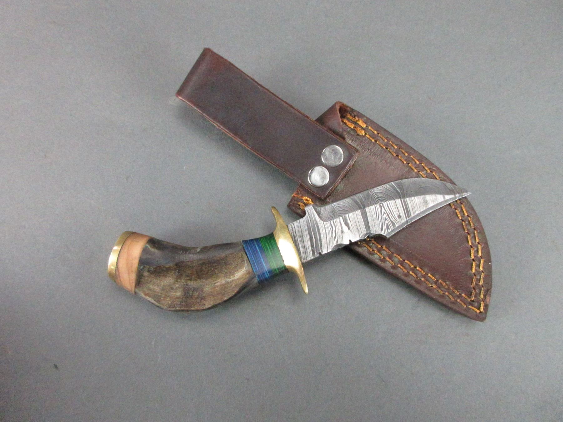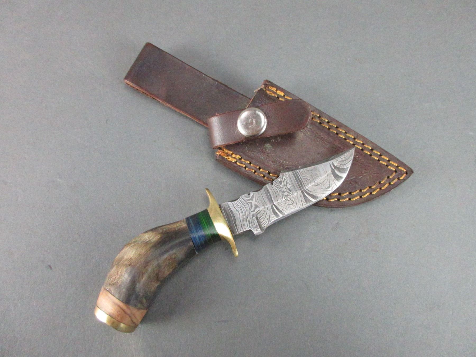Damascus Knife With Rams Horn Handle- Sheath- 3" Blade- 2.75" Handle