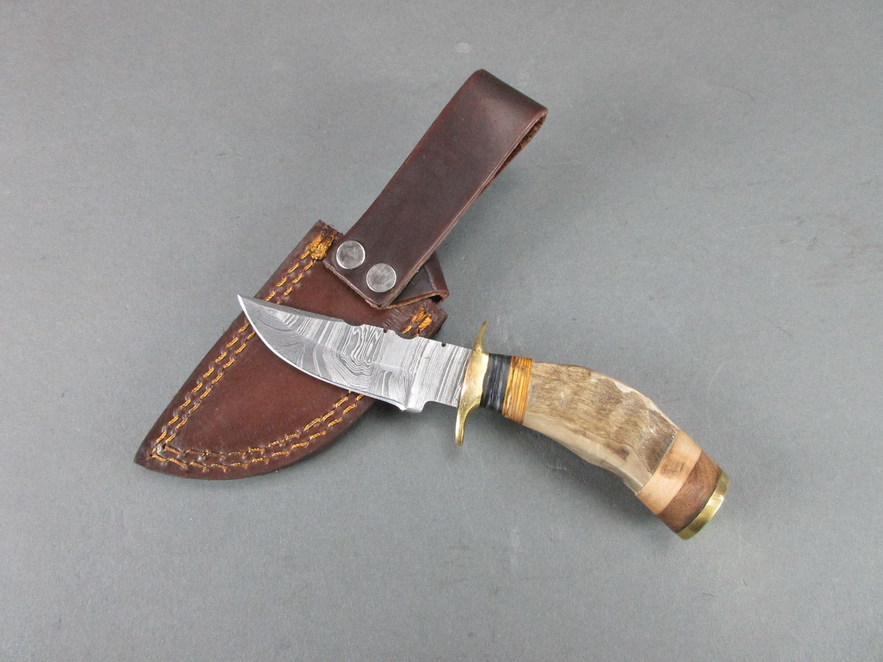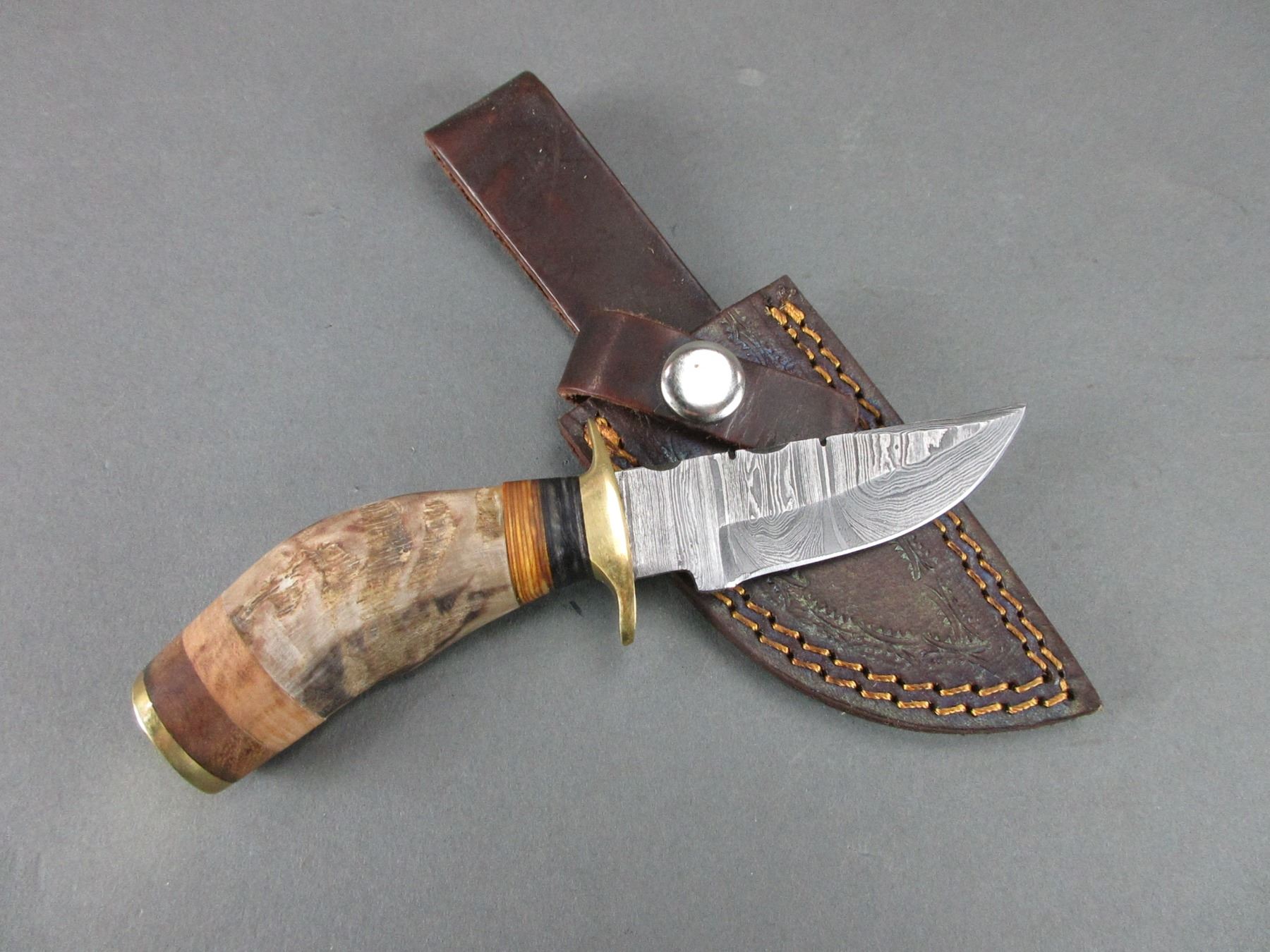 Damascus Knife With Rams Horn Handle- Sheath- 3" Blade- 3" Handle