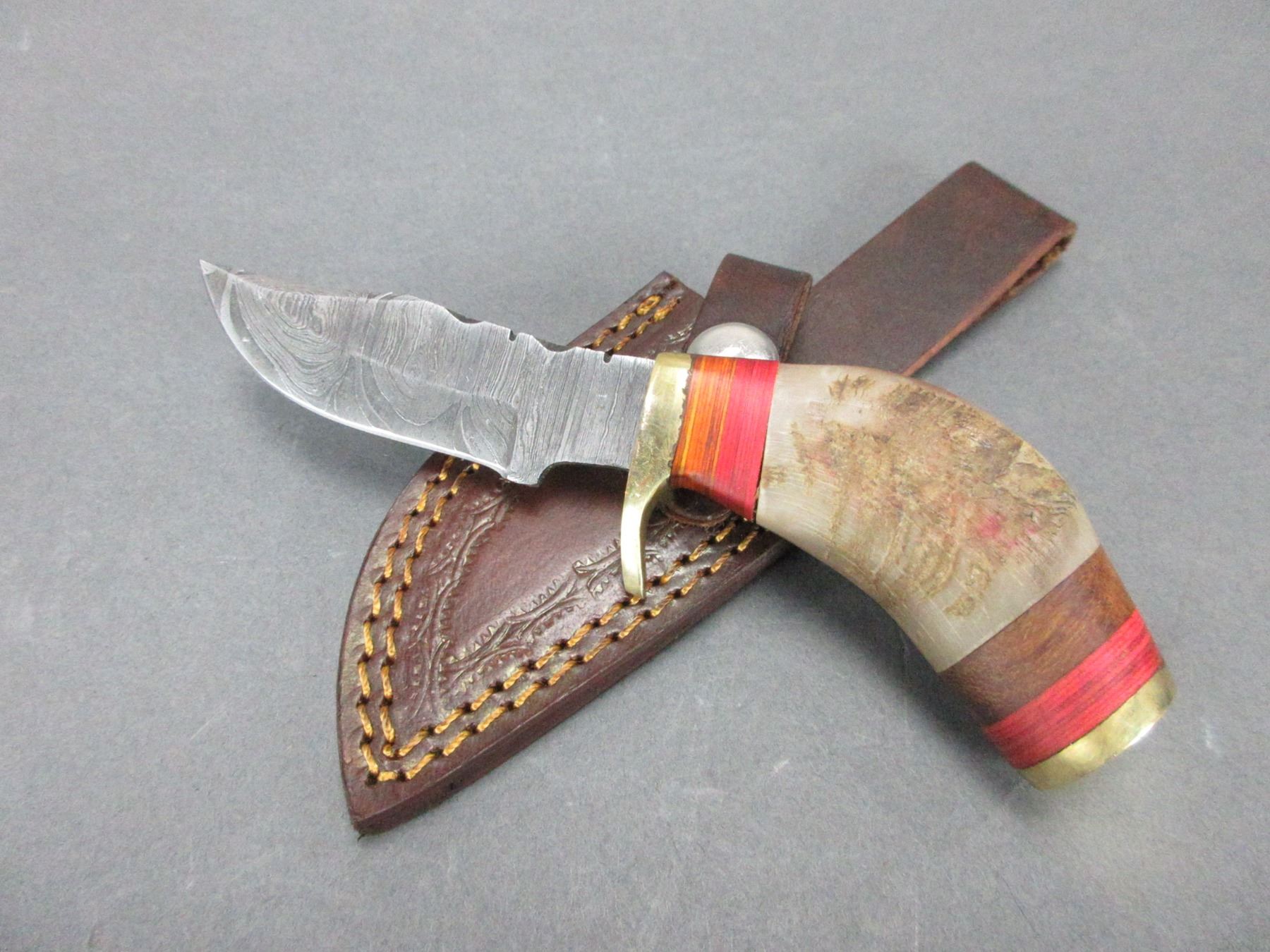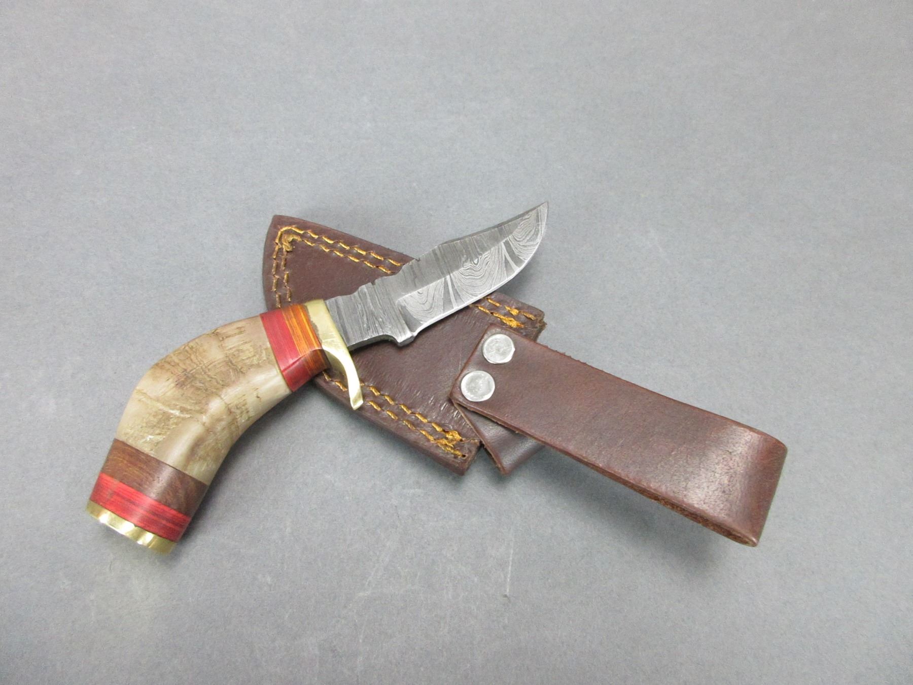 Damascus Knife With Sheath- 3" Blade- 3" Rams Horn Handle