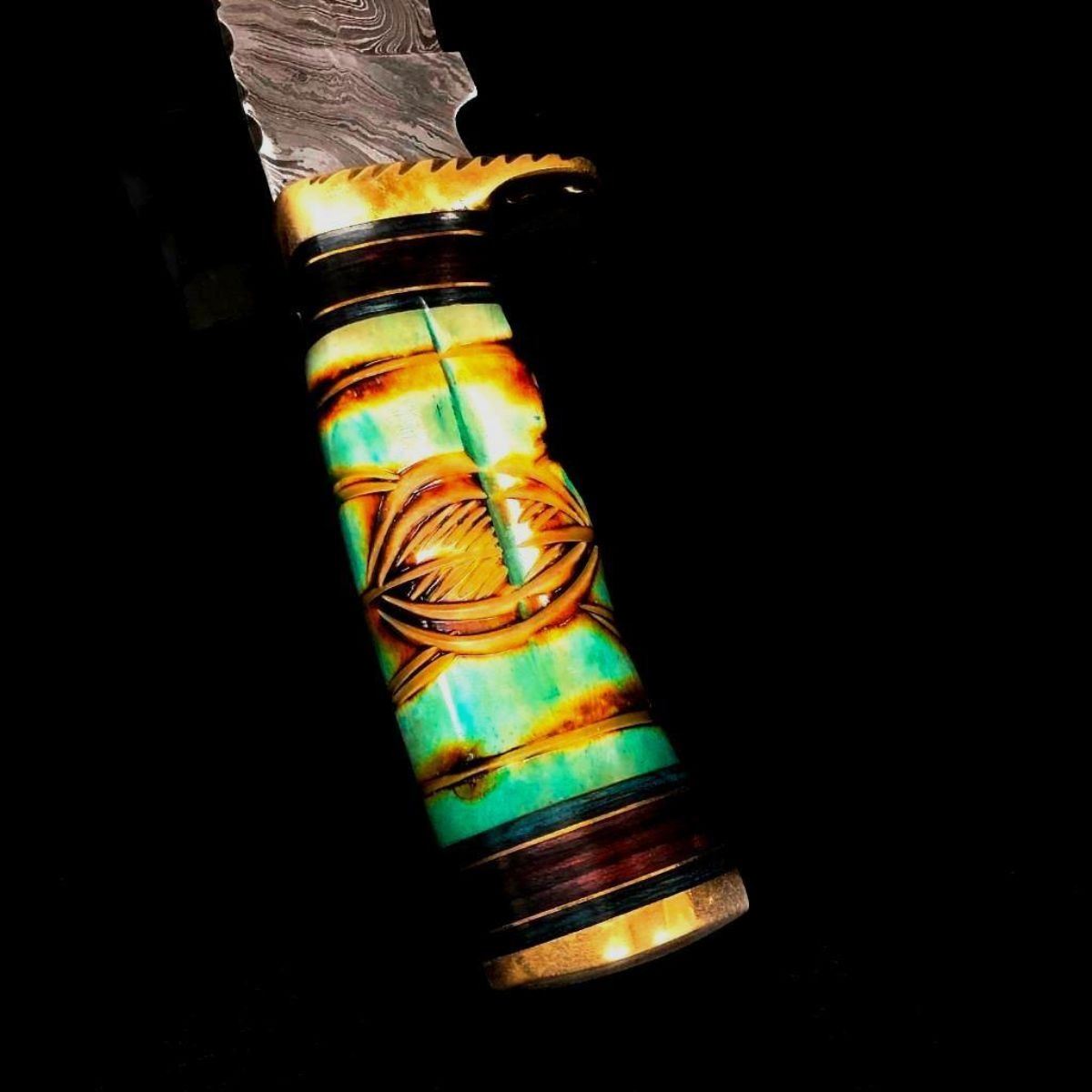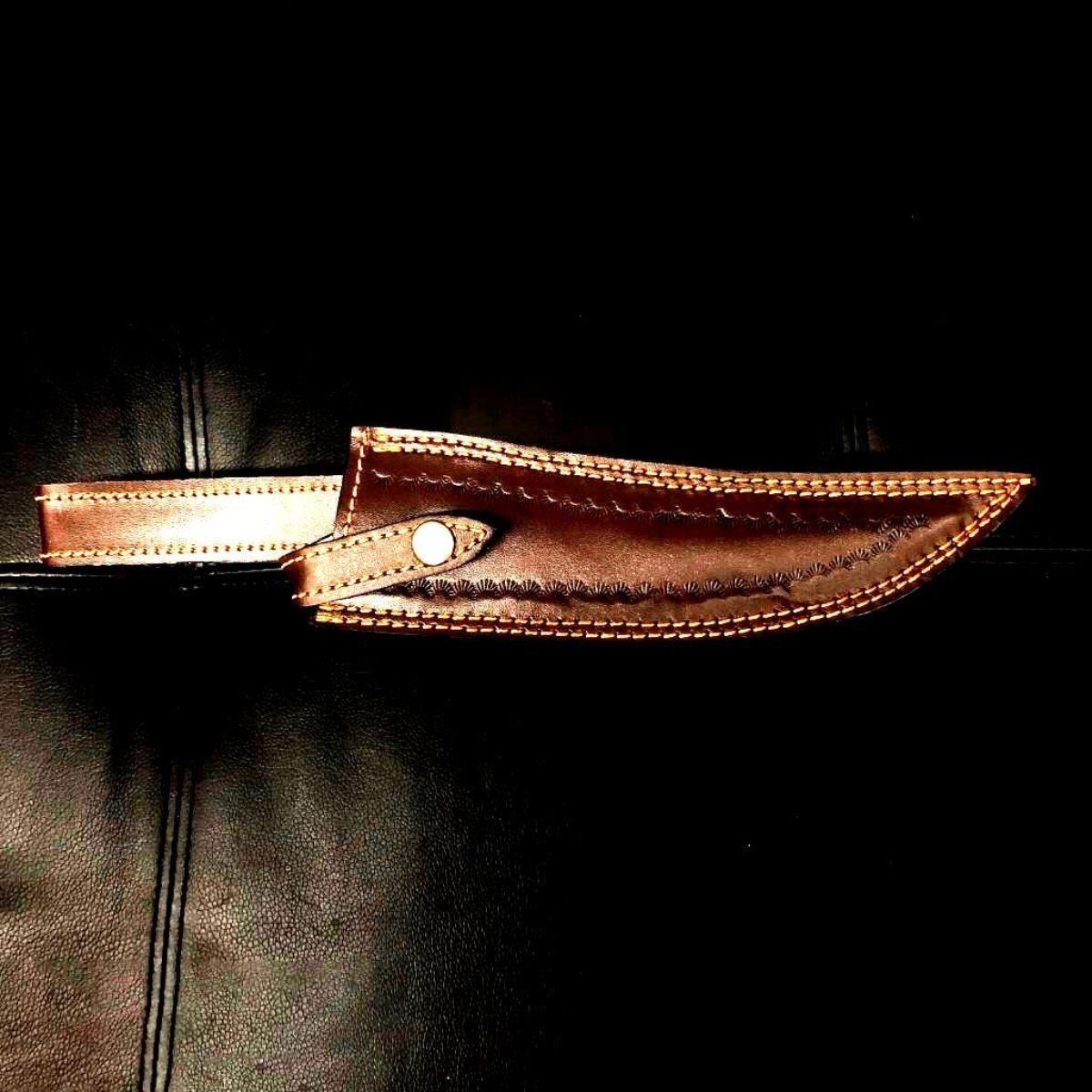 High Quality steel is utilized to forge the finest product in the world. Unique Custom Hand-Forged Damascus Steel Hunting Bowie Knife Handle Construction: Camel Bone, Colored Wood and Brass Spacers. Blade Construction: This superbly designed hunting knife is fully hand made. The Blade is crafted by hand forging 216 Layers of 1095 and 15N20 high carbon tool steels, with Nickle layer. Blade has been given excellent heat treatment to get a 56 to 57 HRC. Blade has a razor sharp edge. Sheath Construction: High Quality Thick Leather Specs: Total Length: 13" Blade: 8" Handle: 5"