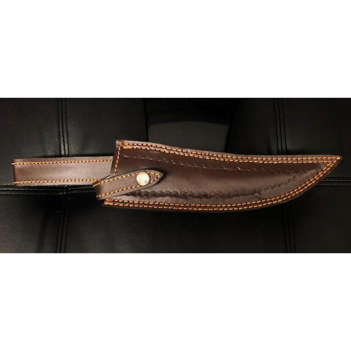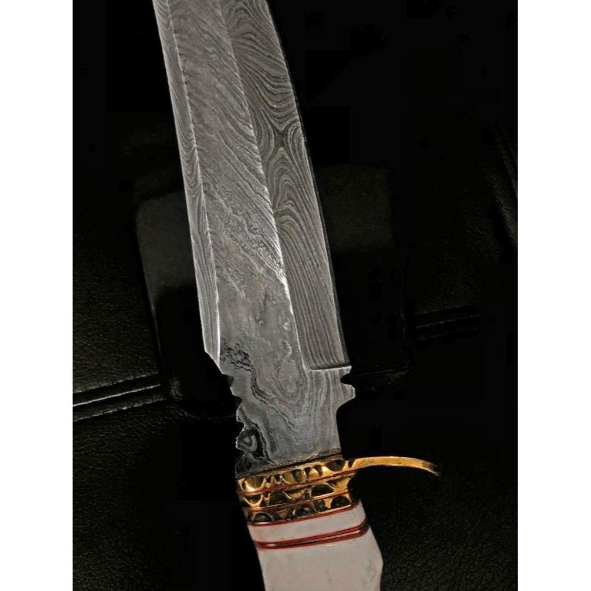 High Quality steel is utilized to forge the finest product in the world. Unique Custom Hand-Forged Damascus Steel Hunting Bowie Knife Handle Construction: Camel Bone, Colored Wood and Brass Spacers. Blade Construction: This superbly designed hunting knife is fully hand made. The Blade is crafted by hand forging 216 Layers of 1095 and 15N20 high carbon tool steels, with Nickle layer. Blade has been given excellent heat treatment to get a 56 to 57 HRC. Blade has a razor sharp edge. Sheath Construction: High Quality Thick Leather Specs: Total Length: 13" Blade: 8" Handle: 5"
