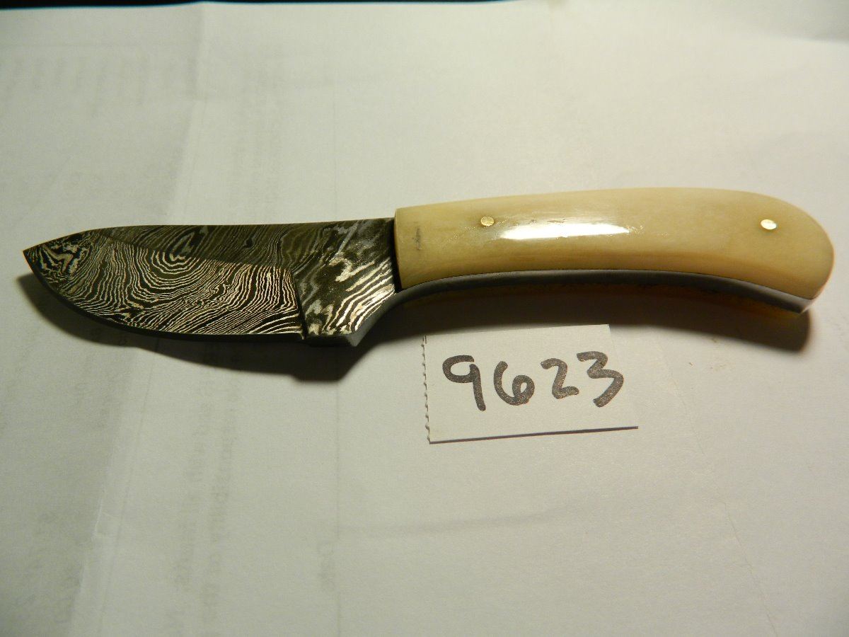 Skinner White Smooth Bone - 6" overall. 2 3/4" Damascus steel wide bellied skinner blade. Full tang. White smooth bone handles. Embossed brown leather belt sheath.