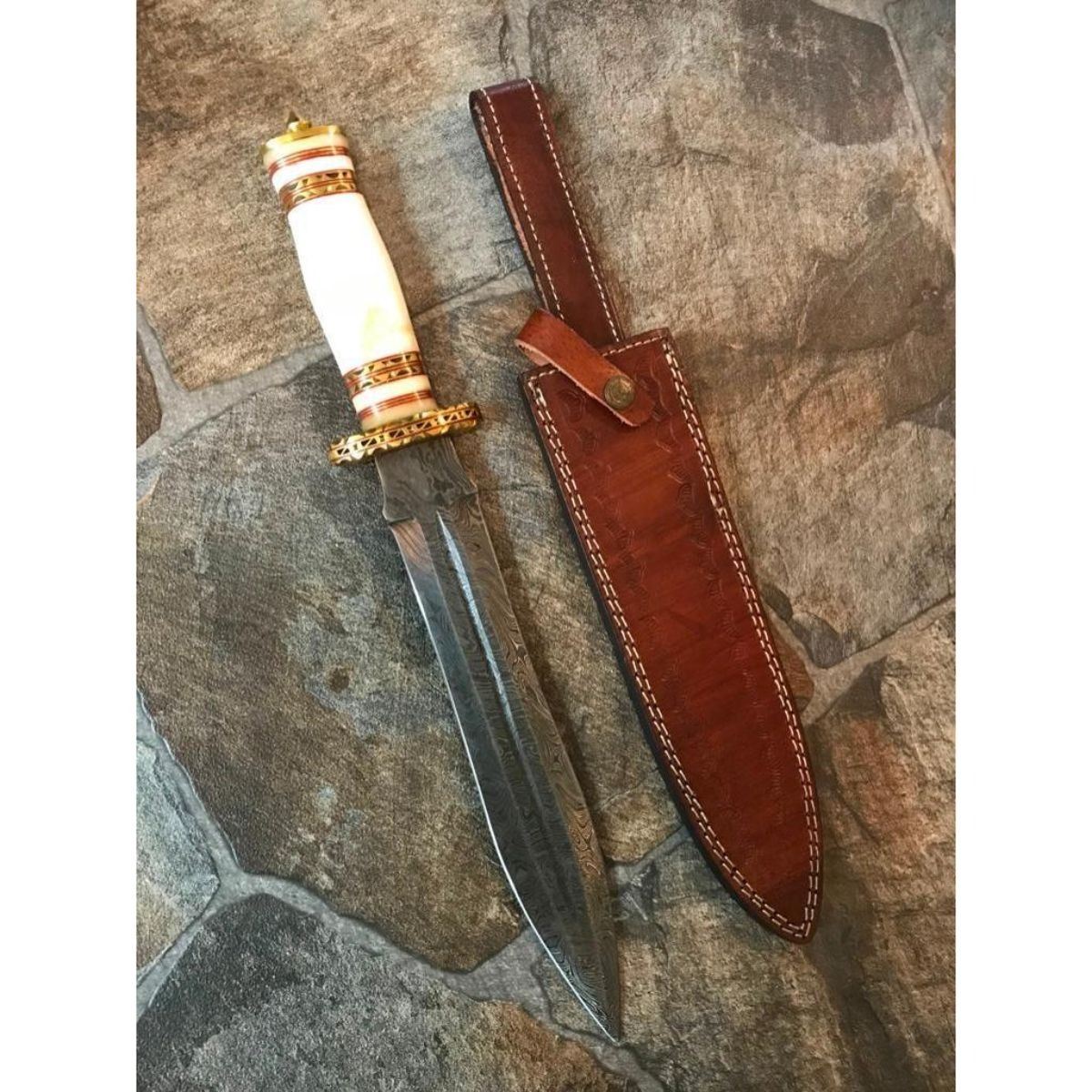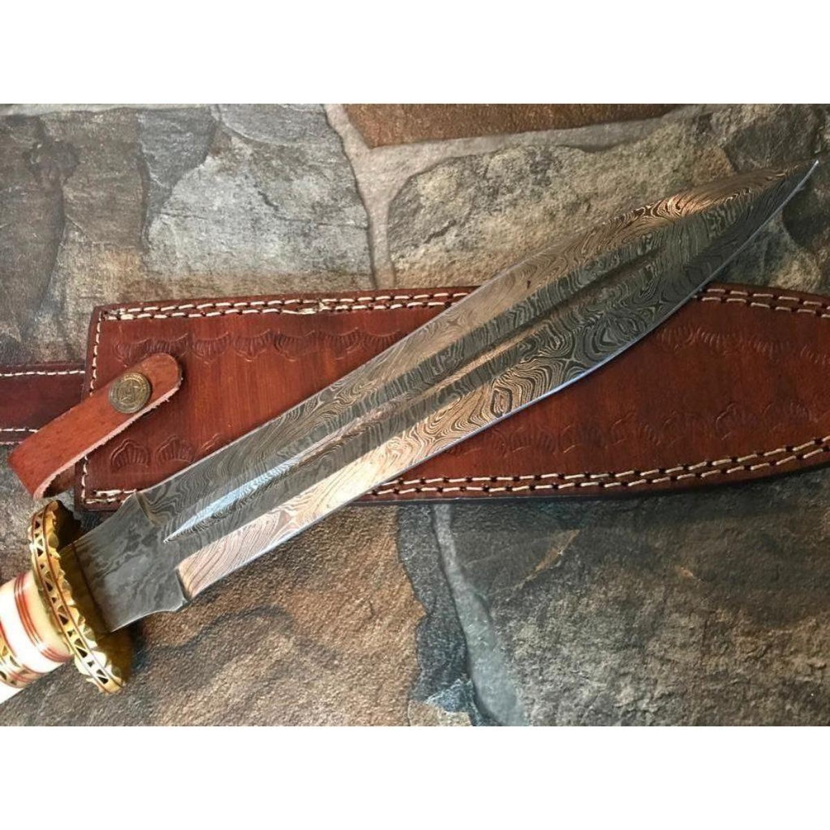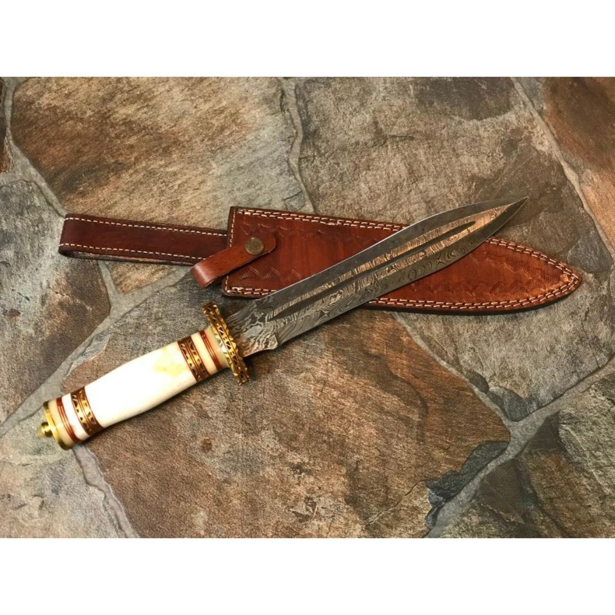 Hand-made custom hunting Bowie Knife. Damascus steel forged with above 216 layers of 1095 & 15N20 high carbon tool steels with nickle layer. Blade has been given excellent heat treatment to get a 56 to 57 HRC. Bone handle with decorative brass spacers. Comes with leather sheath. 14 1/2" overall length. 9" blade length, 4mm thick.     Â