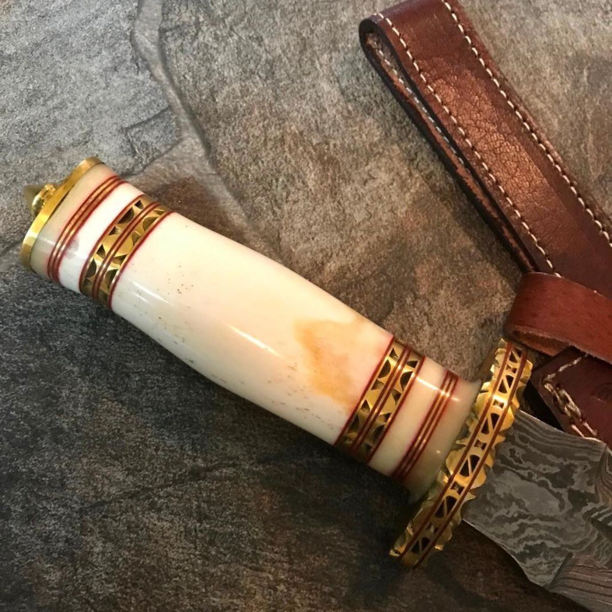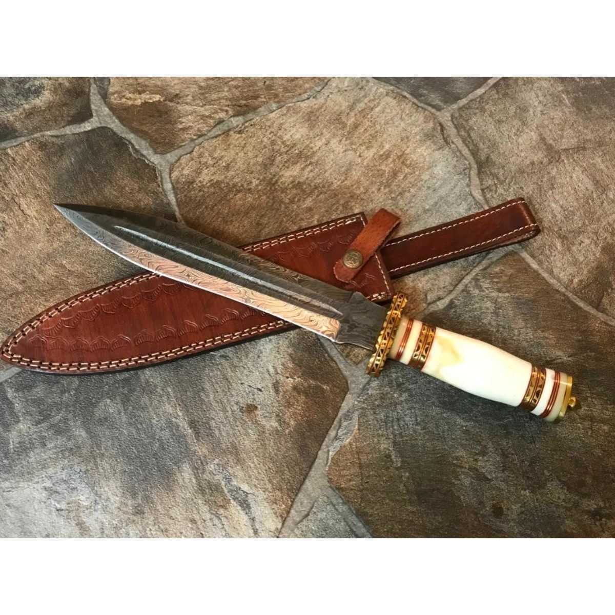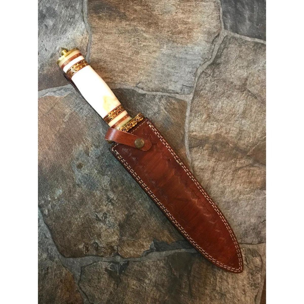 Hand-made custom hunting Bowie Knife. Damascus steel forged with above 216 layers of 1095 & 15N20 high carbon tool steels with nickle layer. Blade has been given excellent heat treatment to get a 56 to 57 HRC. Bone handle with decorative brass spacers. Comes with leather sheath. 14 1/2" overall length. 9" blade length, 4mm thick.     Â