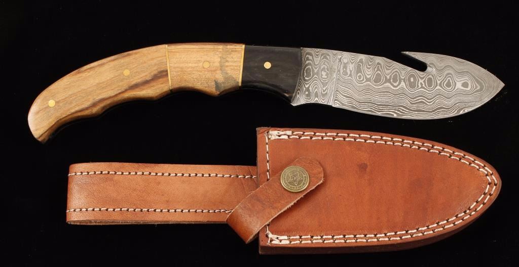 Extended olive wood and black bull horn handle. Comes with a genuine leather sheath. Custom made by Kevin Johnson, Vista, CA.
