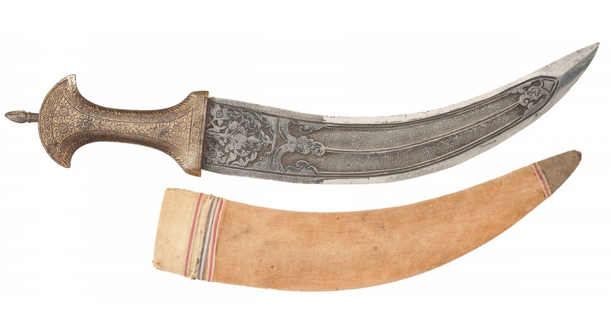 Late 19th century tourist khanjar dagger. Measuring 16 1/2 inches overall, with an 11 inch curved double fuller blade. The blade shows polished edges and a fine "watered" pattern, with deeply chiseled floral and Fleur-de-Lis style embellishment. Extensive gold koftgari decoration has been masterfully executed on the metal hilt, in a mixture of floral, scroll, and sunwheel patterns together with a small faceted knob on the pommel. With a fabric covered scabbard. Provenance: The William Ashby Collection