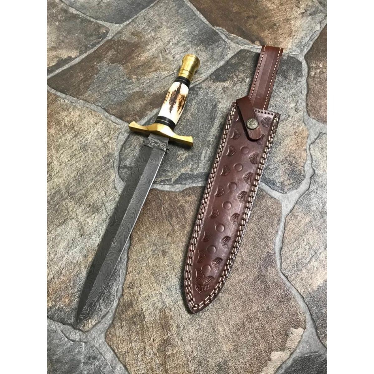Hand-made custom Damascus steel hunting dagger/ knife with stag horn handle. Hand-forged blade with above 216 layers of 1095 & 15n20 high carbon tool steels, with nickel layer & excellent heat treatment to get to 56 To 57 Hrc. Leather sheath. Overall length 14.5†Blade Length 9.5’’ Handle length 5.0’’.