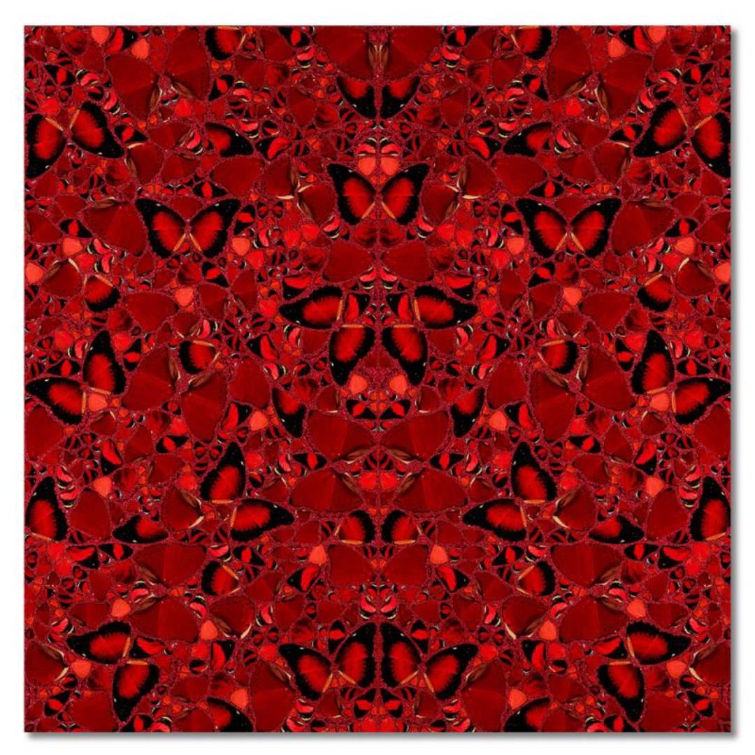 "The Empresses (H10-3 Theodora)" is a limited edition laminated giclee on aluminium composite, screen printed with glitter by Damien Hirst. The piece is signed and numbered on its label and comes with a certificate of authenticity. Measures approximately 39" x 39".