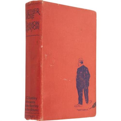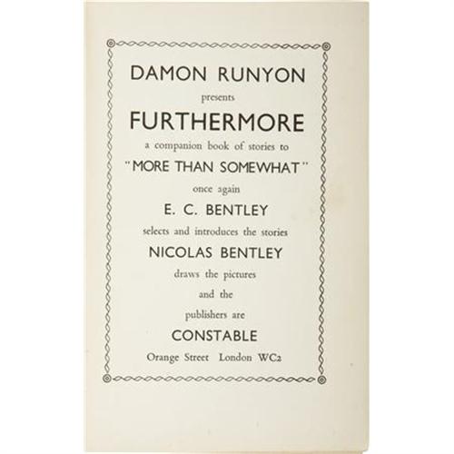 <B>Damon Runyon. </B></I><B><I>Furthermore</B></I></B></I><B>.</B></I> London: Constable and Company Ltd., 1938. <BR>First edition. Octavo. 317 pages. Two additional pages of advertisements at end. Nine black and white illustrations.<BR><BR>Original red cloth with titles and Bentley vignette in black at front cover and spine. A few small stains on boards, moderate wear and bumping of corners. Spine is slightly skewed with moderate wear to head and tail. Hinge is a beginning to loosen, textblock is quite nice with a few minor smudges here and there. Overall a great collection of stories in very good to fine condition. A collection of stories, the companion to <I>More Than Somewhat</B></I>. Introduced by E.C.Bentley with illustrations by Nicholas Bentley.<BR><BR><b>Shipping:</b> Books & Catalogs (<a target="_blank" href="http://www.heritageauctions.com/common/shipping.php">view shipping information</a>)