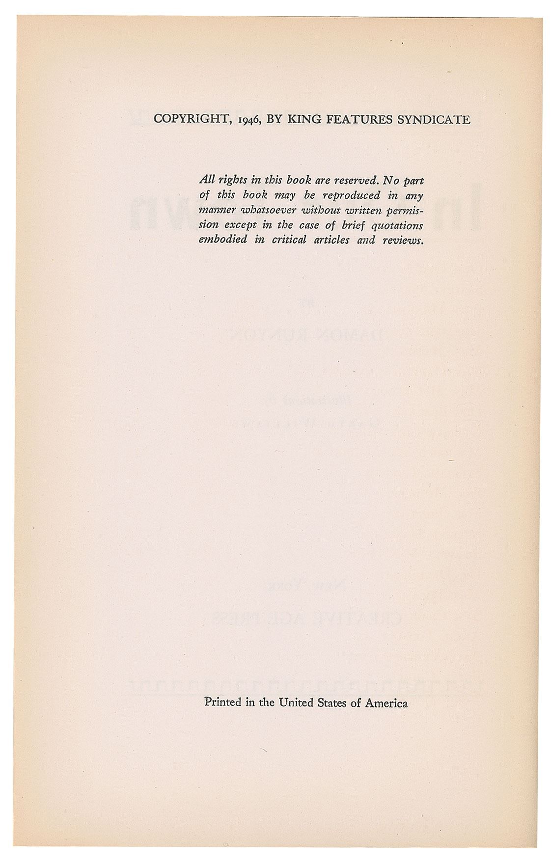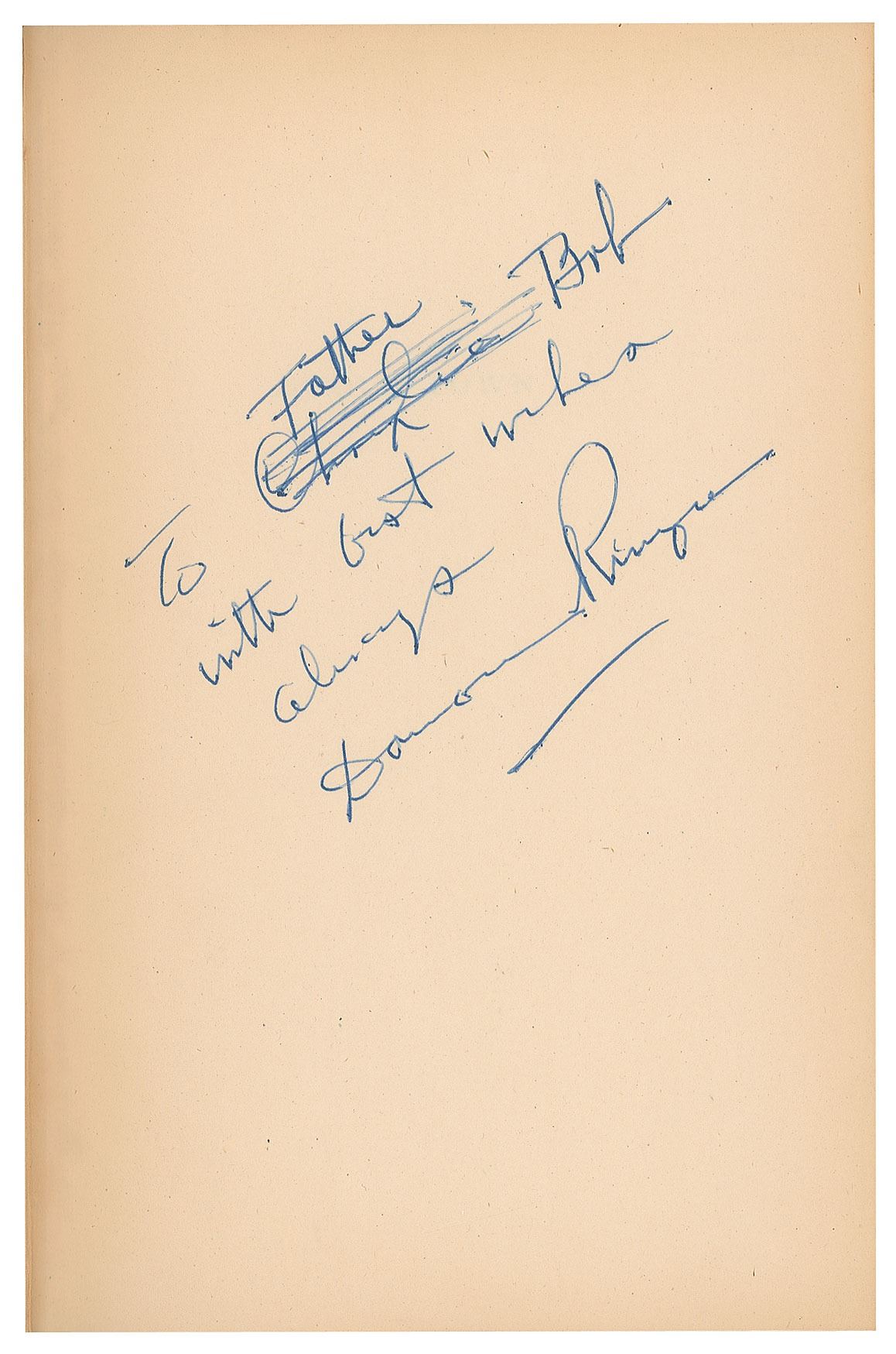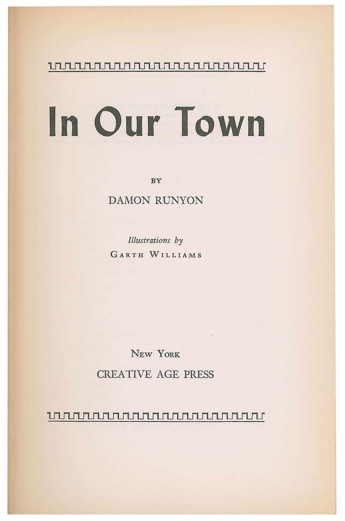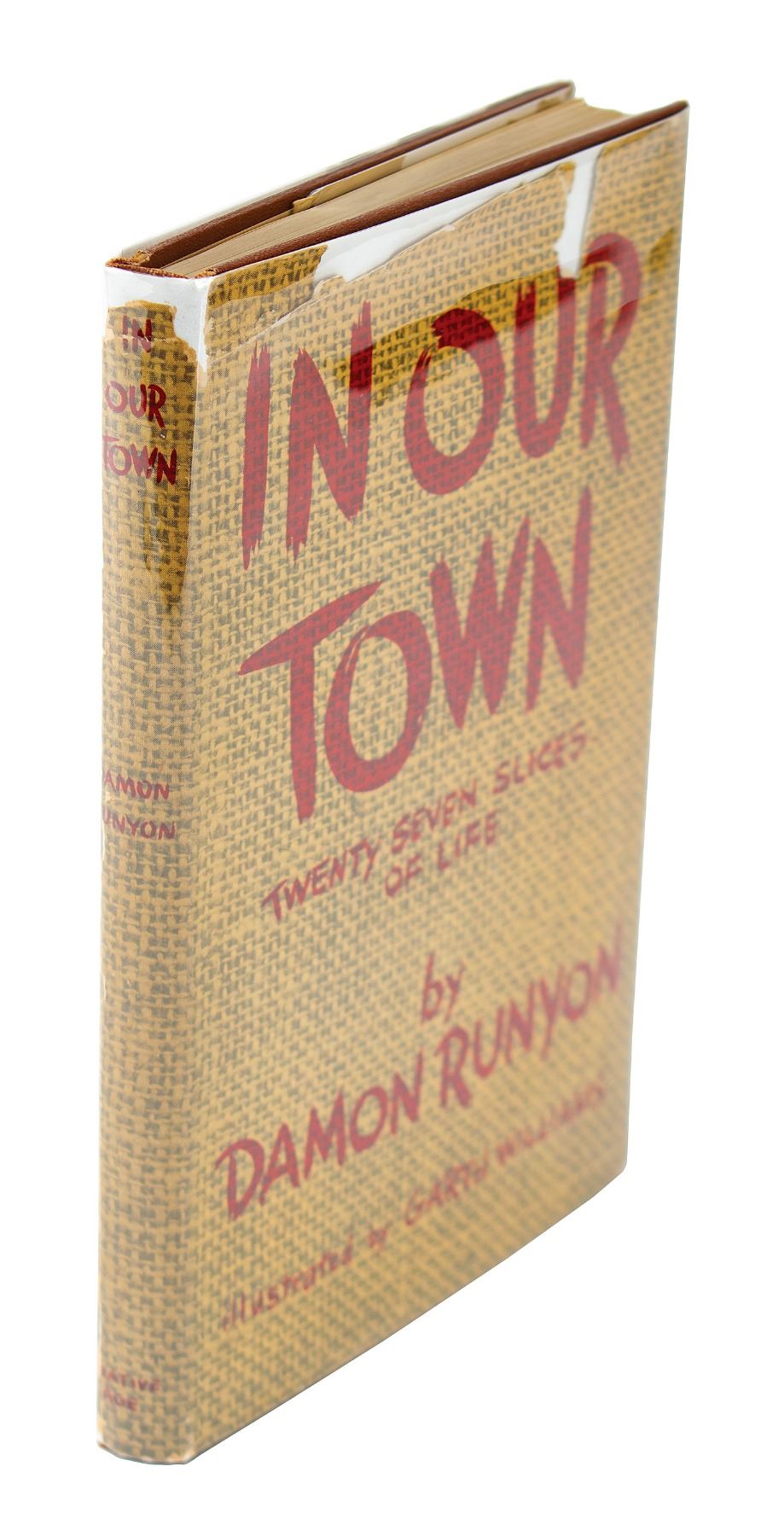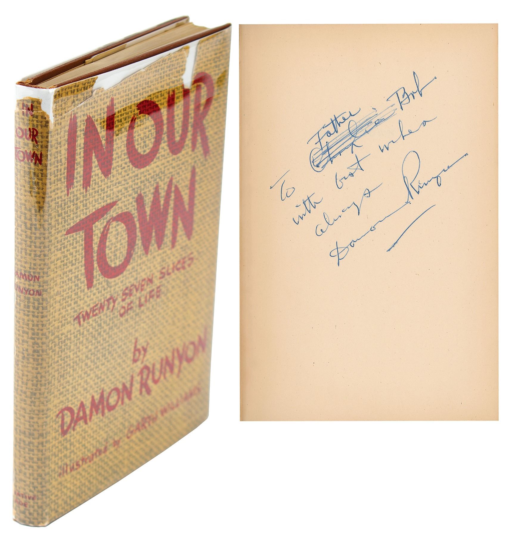 Signed book: In Our Town. First edition. NY: Creative Age Press, 1946. Hardcover with dust jacket, 6 x 8.75, 120 pages. Signed and inscribed on the first free end page in blue ballpoint, "To Father Bob, with best wishes always, Damon Runyon," with one word struck through. Autographic condition: fine. Book condition: VG+VG-, with substantial chips and losses to top edge of the dust jacket.